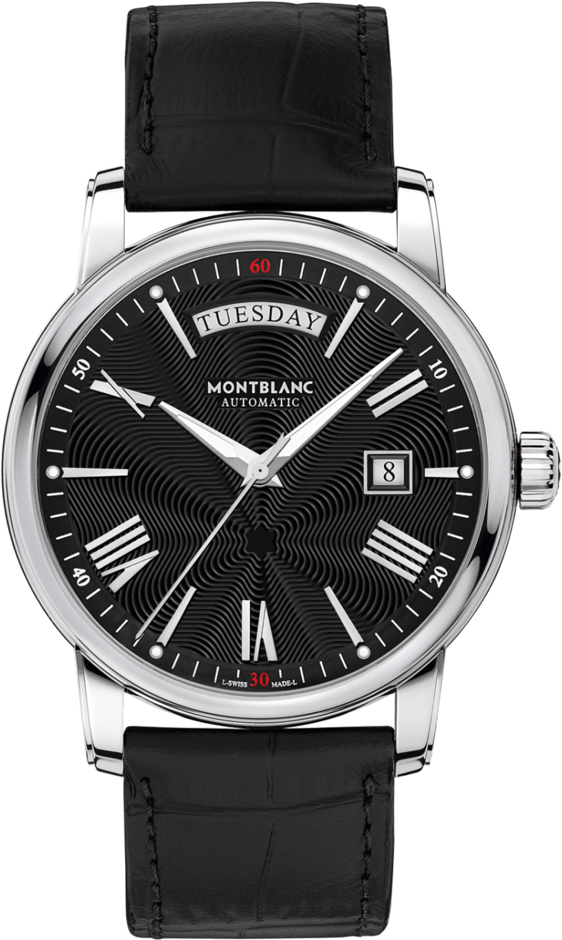 Montblanc 4810 Day-Date kết hợp chức năng hữu ích với sự tinh tế tinh tế. Bộ máy Calibre MB 24.18 của nó cung cấp chỉ báo thứ và thứ trong các cửa sổ riêng biệt. Cả hai đều được sắp xếp hài hòa trên mặt số màu đen được tô điểm bởi họa tiết guilloché ngôi sao nổ phát ra từ vị trí 6 giờ. Cửa sổ hiển thị ngày hình vòm nằm ở vị trí giữa 11 và 1 giờ. Một cửa sổ hình chữ nhật ở vị trí 3 giờ hiển thị ngày. Mặt số được bao quanh bởi một đường kim phút chính xác với các chấm SuperLumiNova® ở giờ lẻ và vạch 30 và 60 giây được đánh dấu màu đỏ. Được bổ sung bằng dây đeo bằng da cá sấu màu đen, vỏ 40,5 mm được làm bằng thép không gỉ với các sừng tròn và đường viền bezel hoàn thiện bằng sa tanh nhấn mạnh sự tinh tế cổ điển của chiếc đồng hồ.