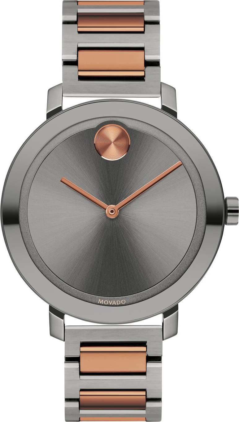 Movado OLD Evolution, vỏ và vòng đeo tay bằng thép không gỉ mạ ion hai tông màu xám và đồng 34 mm với mặt số tông màu xám.