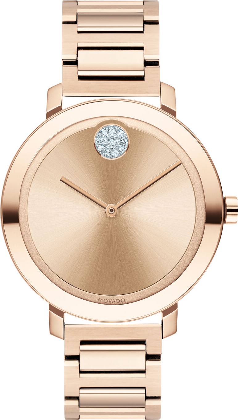 Movado Bold Evolution, Vỏ và vòng đeo tay bằng thép không gỉ mạ ion màu vàng hồng nhạt 34 mm với mặt số tông màu vàng hồng nhạt và chấm pha lê.