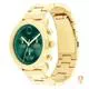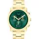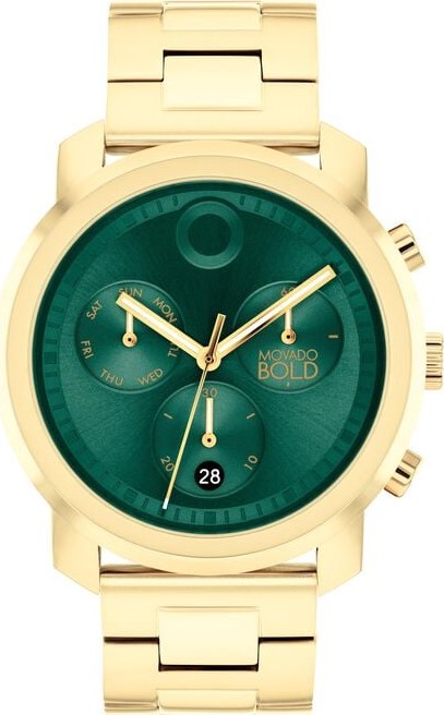 Gặp gỡ thời gian với thái độ hiện đại trong chiếc đồng hồ bấm giờ này với dây đeo mắt xích mềm mại. Đồng hồ Movado Trend dành cho nam, vỏ PVD vàng vàng 44mm và dây đeo PVD vàng vàng, mặt số màu xanh lá cây, khoáng K1, Bộ máy bấm giờ Thụy Sĩ