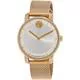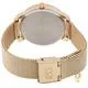 Vỏ thép không gỉ mạ ion vàng nhạt và dây đeo dạng lưới. Vành thép không gỉ tông vàng cố định. Mặt số tia mặt trời màu bạc với kim đồng hồ tông vàng. Loại mặt số: Analog. Bộ máy thạch anh. Tinh thể K1 chống trầy xước. Nắp lưng đồng hồ chắc chắn. Vỏ tròn, kích thước vỏ: 34 mm. Khóa gập có chốt an toàn. Chức năng: giờ, phút. Khả năng chống nước 30m
