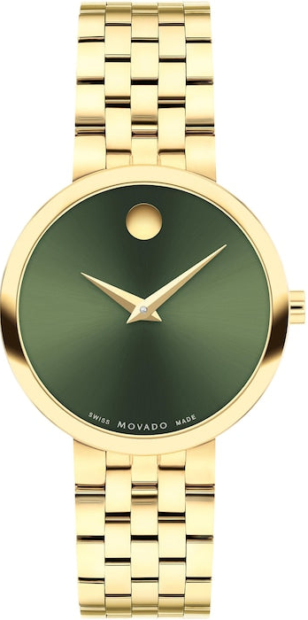 Vỏ và dây đeo bằng thép không gỉ mạ vàng. Vòng bezel cố định bằng thép không gỉ mạ vàng. Mặt số màu xanh lá cây với kim chỉ giờ và phút mạ vàng. Logo Movado ở vị trí 12 giờ. Loại mặt số: Analog. Bộ máy quartz. Mặt kính sapphire chống trầy xước. Núm vặn kéo/đẩy. Nắp lưng kín. Hình dạng vỏ tròn, kích thước vỏ: 29,5 mm. Khóa gập có chốt an toàn. Chống nước ở độ sâu 30 mét / 100 feet.