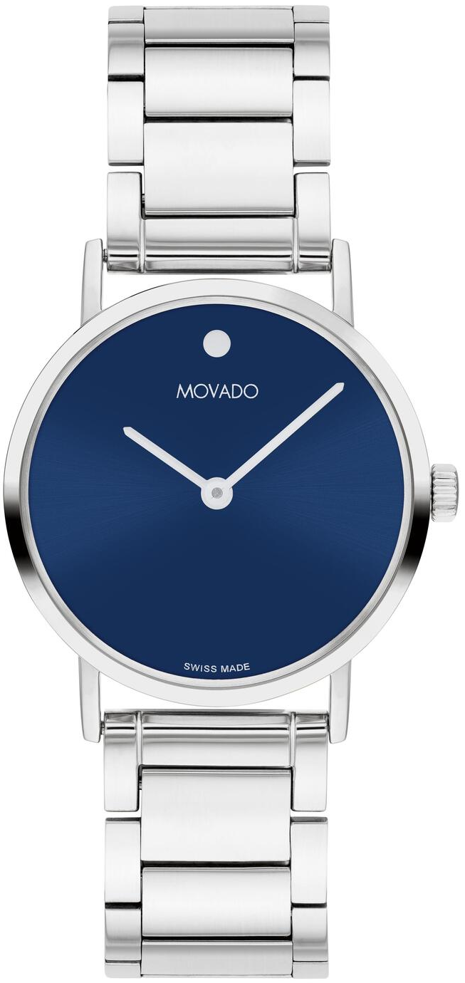 Đồng hồ nữ Movado Signature, vỏ thép không gỉ 28mm, mặt số màu xanh lam, dây đeo thép không gỉ. Mặt số màu xanh lam kiểu Museum với chấm phẳng. Đường kính vỏ 28mm. Chất liệu vỏ thép không gỉ. Chất liệu kính sapphire. Khả năng chống nước 30 mét. Bộ máy thạch anh Thụy Sĩ. Dành cho nữ. Dây đeo thép không gỉ dạng mắt xích.