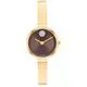 Chiếc vòng tay thanh lịch, toát lên vẻ tinh tế giản dị trên từng đường cong. Vòng tay Movado Trend dành cho nữ, vỏ và dây đeo bằng thép vàng sáng mạ ion 24mm, mặt số màu sô cô la với vạch chỉ giờ bằng pha lê, khoáng chất K1, bộ máy Quartz. Khả năng chống nước 3 ATM.
