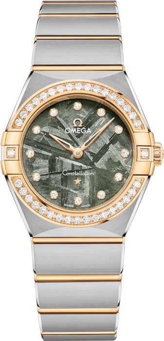 Từ năm 1952, OMEGA Constellation đã được lấy cảm hứng từ sự chuyển động chính xác của các vì sao. Với mẫu đồng hồ đặc biệt này, chủ đề về các vì sao được nâng tầm hơn nữa, với sự ra mắt của mặt số thiên thạch đầy mê hoặc. Chiếc đồng hồ 28 mm này được trang bị vỏ và dây đeo đơn sắc làm từ thép không gỉ và vàng vàng 18K, với các chi tiết đặc trưng của dòng Constellation bao gồm các móng vuốt được đánh bóng, các mặt cắt hình bán nguyệt và vành bezel đính kim cương. Mặt số ấn tượng được tạo thành từ một mảnh thiên thạch sắt nguyên chất, được xử lý màu xanh lá cây. Hoa văn tự nhiên bên trong thiên thạch là độc nhất vô nhị cho mỗi mẫu, đồng nghĩa với việc không có hai mặt số nào giống hệt nhau. Đồng hồ được hoàn thiện với các vạch chỉ giờ bằng kim cương và một ngôi sao Constellation bằng vàng vàng 18K. Đằng sau huy chương Đài quan sát Chòm sao được đóng dấu ở mặt sau, chiếc đồng hồ ấn tượng này được vận hành bởi bộ máy OMEGA Calibre 4061. Bộ máy thạch anh với tính năng "Long Life" (Tuổi thọ dài) giúp tối đa hóa thời lượng pin. Logo Omega màu đỏ độc quyền với các chi tiết mạ rhodium và vân tròn. Chiều dài càng nối tiếp càng 30,50 mm. Độ dày 8,48 mm. Đường kính vỏ 28 mm. Vỏ thép - vàng vàng. Màu mặt số Xanh lá cây. Pha lê: Mặt kính sapphire chống xước hình vòm, phủ lớp chống phản quang ở cả hai mặt. Khả năng chống nước 3 bar (30 mét / 100 feet). Tổng trọng lượng sản phẩm (xấp xỉ) 82 g. Calibre Omega 4061. Loại máy: Thạch anh. Tuổi thọ pin 48 tháng. Chất liệu: Thép - vàng vàng. Kiểu khóa: Khóa bướm với chế độ cài đặt thoải mái.