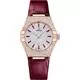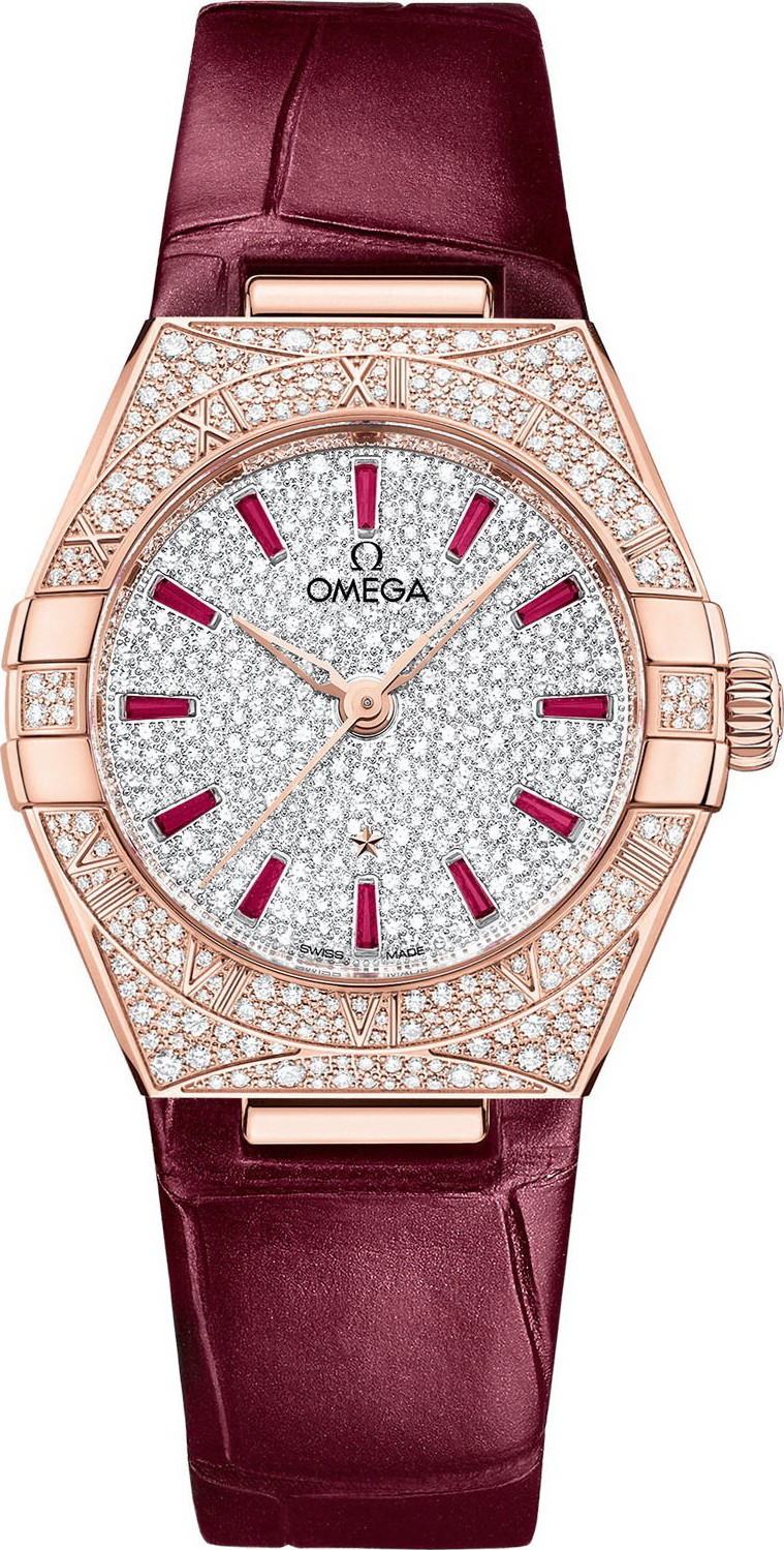 Là một phần của bộ sưu tập đồng hồ tinh xảo, chiếc đồng hồ này kết hợp thiết kế Constellation mang tính biểu tượng với bộ sưu tập 634 viên đá quý rực rỡ với tổng trọng lượng 1,56 ct. Vỏ đồng hồ 29 mm được chế tác từ vàng Sedna™ 18K và được đính 108 viên kim cương cắt nguyên khối. Hai bên đồng hồ là những móng vuốt được đánh bóng huyền thoại, cùng với vành bezel có chữ số La Mã chạm nổi và 160 viên kim cương cắt nguyên khối. Sự chú ý đáng kinh ngạc đến từng chi tiết được tiếp tục trên mặt số bằng vàng trắng 18K, được đính hoàn toàn 354 viên kim cương cắt đơn theo phong cách tuyết. Ngoài ra còn có một ngôi sao Constellation bằng vàng Sedna™ 18K, và đẹp nhất là một vòng tròn gồm 12 vạch chỉ giờ bằng hồng ngọc cắt baguette trong các giá đỡ bằng vàng trắng 18K. Chiếc đồng hồ được hoàn thiện bằng dây đeo bằng da màu đỏ trên khóa bằng vàng Sedna™ 18K được đánh bóng. Đằng sau lớp kính sapphire ở mặt sau là bộ máy OMEGA Co-Axial Master Chronometer Calibre 8703. Khoảng cách giữa các vấu: Mở vỏ: 17,6 mm. Khoảng cách giữa vấu và vấu: Mở vỏ: 31,20 mm. Độ dày: Mở vỏ: 12,20 mm. Đường kính vỏ: Mở vỏ: 29 mm. Vỏ: Vàng Sedna™. Màu mặt số: Trắng. Kính sapphire chống xước hình vòm, phủ lớp chống phản quang ở cả hai mặt. Khả năng chống nước: 5 bar (50 mét / 165 feet). Tổng trọng lượng sản phẩm (xấp xỉ): 59 g. Bộ máy Omega 8703. Kiểu máy: Tự lên dây cót. Dự trữ năng lượng: 50 giờ.
