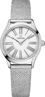 Mini Trésor là phiên bản tinh tế của bộ sưu tập đồng hồ nữ hiện đại nhất của OMEGA. Với kích thước nhỏ gọn và phong cách năng động, chiếc đồng hồ này thực sự nổi bật trên cổ tay. Mẫu đồng hồ này được làm từ thép không gỉ, sở hữu vỏ 26 mm với những viên kim cương uốn cong thanh lịch dọc theo mỗi cạnh. Núm vặn cũng được đính một viên kim cương duy nhất, bao quanh bởi một bông hoa gốm lai màu đỏ. Mặt số hình vòm được chế tác bằng men "Grand Feu" màu trắng ngà và được tô điểm bằng các chữ số La Mã chuyển màu xám. Chiếc đồng hồ này được đặt trên dây đeo bằng thép không gỉ dạng lưới, được chạm nổi họa tiết lụa và khóa gập đặc biệt. Bên trong, nó được vận hành bởi bộ máy OMEGA Calibre 4061, nằm sau nắp lưng bằng kính sapphire tráng kim loại với hiệu ứng gương và họa tiết "Her Time". Khoảng cách giữa các vấu: Mở vỏ: 13 mm. Khoảng cách giữa các vấu: Mở vỏ: 31,13 mm. Độ dày: Mở vỏ: 7,46 mm. Đường kính vỏ: Mở vỏ: 26 mm. Vỏ thép. Mặt số màu trắng. Mặt kính sapphire hình vòm, chống trầy xước, phủ lớp chống phản quang bên trong. Khả năng chống nước 3 bar (30 mét / 100 feet). Tổng trọng lượng sản phẩm (xấp xỉ) 39 g. Bộ máy Omega 4061. Loại máy Quartz. Tuổi thọ pin 48 tháng. Chất liệu thép. Bộ máy Quartz OMEGA 4061 với tính năng "Long Life" giúp tối đa hóa thời lượng pin. Logo Omega màu đỏ độc quyền với các chi tiết mạ rhodium và vân tròn.