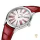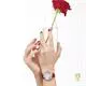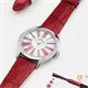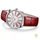 Đối với mẫu này, vỏ mỏng 36 mm được chế tác bằng thép không gỉ và đính 38 viên kim cương cắt đơn, uốn cong thanh lịch dọc theo mỗi cạnh. Mặt số màu trắng sơn mài được bao quanh bởi các chữ số La Mã chuyển màu đỏ, trong khi núm vặn có một viên kim cương duy nhất, lần này được bao quanh bởi một bông hoa gốm màu đỏ được làm từ năm logo OMEGA.