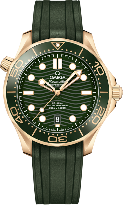 Từ năm 1993, Seamaster Professional Diver 300M đã có một lượng người theo dõi huyền thoại. Bộ sưu tập hiện đại ngày nay đã kế thừa di sản đại dương nổi tiếng đó và cập nhật nó với sự đổi mới và thiết kế tốt nhất của OMEGA. Mẫu 42 mm này được chế tác bằng Vàng Moonshine™ 18K và bao gồm vành gốm xanh lá cây với thang lặn Ceragold™. Mặt số cũng được làm bằng gốm xanh lá cây đánh bóng và có các sóng được khắc bằng laser và cửa sổ ngày ở vị trí 6 giờ. Kim khung xương được làm bằng Vàng Moonshine™ 18K và được phủ Super-LumiNova trắng, trong khi van thoát khí heli đã được thiết kế hình nón mới. Đồng hồ được trình bày trên dây đeo cao su màu xanh lá cây và được điều khiển bởi OMEGA Master Chronometer Calibre 8801, có thể nhìn thấy qua tinh thể sapphire trên nắp lưng có viền sóng. Khoảng cách giữa các vấu 20 mm. Khoảng cách từ vấu này đến vấu kia là 49,90 mm. Độ dày 13,72 mm. Đường kính vỏ 42 mm. Vỏ bằng vàng Moonshine™. Màu mặt số Xanh lá cây. Pha lê: Mặt kính sapphire chống xước hình vòm, được xử lý chống phản quang ở cả hai mặt. Khả năng chống nước 30 bar (300 mét / 1000 feet). Tổng trọng lượng sản phẩm (xấp xỉ) 152 g. Bộ máy Omega 8801. Kiểu chuyển động: Tự động lên dây cót. Dự trữ năng lượng 55 giờ