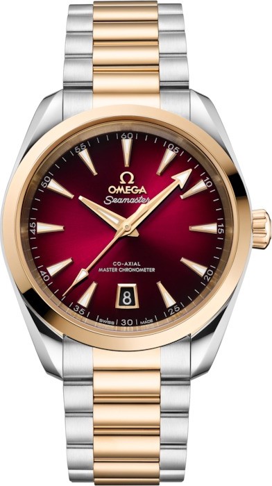 Seamaster Aqua Terra là một sự tôn vinh tuyệt vời dành cho di sản hàng hải phong phú của OMEGA. Mẫu đồng hồ 38 mm này có vỏ đối xứng bằng thép không gỉ và vàng 18K Moonshine™ với nắp lưng vặn có thiết kế viền sóng. Mặt số màu đỏ tía được chải tia nắng, với hiệu ứng chuyển màu đen, có logo OMEGA bằng vàng 18K Moonshine™ và cửa sổ hiển thị ngày ở vị trí 6 giờ. Kim và vạch chỉ giờ, cũng bằng vàng Moonshine™ 18K, được phủ chất phát quang Super-LumiNova màu trắng phát ra ánh sáng xanh lam. Đồng hồ được trang bị dây đeo liền khối với các mắt xích trung tâm được đánh bóng và các mắt xích bên ngoài được chải xước, cùng với bộ máy OMEGA Co-Axial Master Chronometer calibre 8800, được chứng nhận theo tiêu chuẩn cao nhất của ngành bởi Viện Đo lường Liên bang Thụy Sĩ (METAS). Khoảng cách giữa hai càng 19 mm. Khoảng cách giữa hai càng 45,10 mm. Độ dày 12,26 mm. Đường kính vỏ 38 mm. Chất liệu vỏ: Thép - Vàng Moonshine™. Màu mặt số: Đỏ. Mặt kính: Kính sapphire cong chống trầy xước với lớp phủ chống phản chiếu ở cả hai mặt. Khả năng chống nước: 15 bar (150 mét / 500 feet). Tổng trọng lượng sản phẩm (xấp xỉ): 114 g. Bộ máy: Omega 8800. Loại máy: Tự động lên dây. Dự trữ năng lượng: 55 giờ. Chất liệu vòng tay: Thép - Vàng Moonshine™. Loại khóa: Khóa bướm với cơ chế điều chỉnh thoải mái.