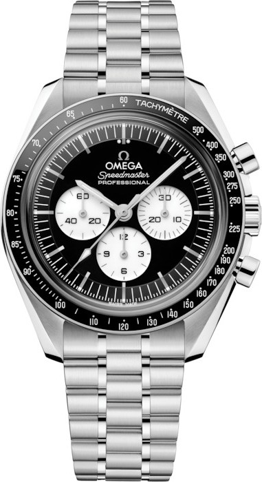 Speedmaster Moonwatch là một trong những chiếc đồng hồ biểu tượng nhất thế giới. Từng tham gia cả sáu lần đổ bộ lên mặt trăng, chiếc chronograph huyền thoại này là minh chứng ấn tượng cho tinh thần tiên phong đầy phiêu lưu của thương hiệu. Mẫu đồng hồ 42 mm này có mặt kính sapphire ở cả mặt trước và mặt sau, được gắn trên dây đeo bằng thép không gỉ đánh bóng-chải. Thiết kế lấy cảm hứng từ chiếc Speedmaster thế hệ thứ 4 được đeo trên mặt trăng. Mặt số bậc thang hai lớp được phủ sơn mài đen bóng, kết hợp với các mặt số phụ được phủ sơn mài trắng bóng nằm trong khung mạ rhodium. Các chi tiết bao gồm logo và vạch chỉ giờ OMEGA, kim kiểu Moonwatch và dấu chấm nổi tiếng trên số 90 trên vòng bezel gốm đen. Đồng hồ được trang bị bộ máy OMEGA Co-Axial Master Chronometer Calibre 3861, cung cấp năng lượng cho mặt số phụ giây nhỏ, bộ đếm 30 phút và bộ đếm 12 giờ, cùng với chức năng chronograph trung tâm. Khoảng cách giữa hai càng dây 20 mm. Khoảng cách giữa hai càng dây 47,50 mm. Độ dày 13,54 mm. Đường kính vỏ 42 mm. Vỏ thép. Màu mặt số đen. Mặt kính sapphire chống trầy xước với lớp phủ chống phản chiếu bên trong. Khả năng chống nước 5 bar (50 mét / 165 feet). Tổng trọng lượng sản phẩm (xấp xỉ) 142 g. Bộ máy Omega 3861. Loại máy lên dây cót thủ công. Thời gian dự trữ năng lượng 50 giờ.