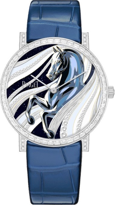 Mẫu đồng hồ: Piaget Altiplano dòng siêu tinh, phiên bản giới hạn "Năm con ngựa". Bộ máy: Bộ máy cơ lên dây bằng tay Piaget Calibre 830P của Thụy Sĩ. Độ dày của máy: 2,5 mm. Năng lực dự trữ: Khoảng 60 giờ. Tần số dao động: 21.600 vph (dao động mỗi giờ). Vỏ đồng hồ: Vàng trắng 18K, đường kính 41 mm, tổng độ dày 8,3 mm. Mặt số: Nổi bật với họa tiết con ngựa 3D nhảy giật được giải thủ công tinh trên nền vàng trắng, sử dụng kỹ thuật tráng men vách ngăn (cloisonné) và champlevé grand feu với các tông màu xanh lam, xám và trắng, làm nghệ nhân tráng men cấp thầy Anita Porchet thực hiện. Vành bezel: Num kim cương cắt kiểu baguette. Vấu nối dây: Đính kim cương cắt kiểu rực rỡ. Núm cứng: Gắn một viên kim cương cắt kiểu hoa hồng. Dây đeo: Dây da cá sấu màu xanh lam có khóa cài bằng vàng trắng 18K. Chống nước: 30 mét. Phiên bản giới hạn: Đây là mẫu đồng hồ cực kỳ độc, được sản xuất duy nhất 18 chiếc trên toàn thế giới. Chiếc đồng hồ này được ra mắt như một phiên bản đặc biệt để chào mừng Tết Nguyên đán (Năm con ngựa).