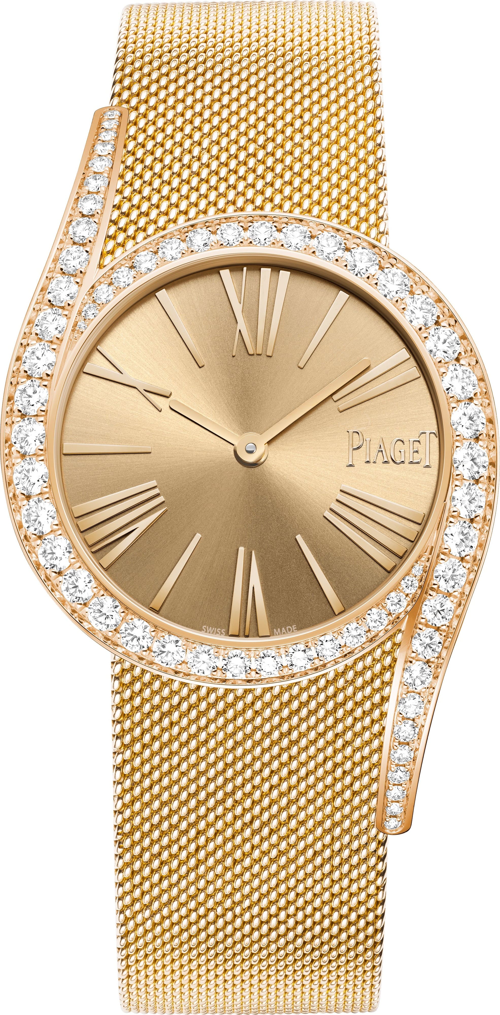 Đồng hồ Limelight Gala, 32 mm. Vỏ bằng vàng hồng 18K nạm 62 viên kim cương cắt giác brilliant (khoảng 1,65 ct). Mặt số màu vàng. Dây đeo dạng lưới Milanese bằng vàng hồng 18K. Khóa cài nạm một viên kim cương cắt giác brilliant (khoảng 0,01 ct). Bộ máy cơ tự động Manufacture 501P1. Chất liệu kim loại: Vàng hồng. Đá quý: Kim cương. Đường kính vỏ: 32 mm. Chất liệu dây đeo: Vàng. Màu dây đeo: Hồng. Hình dạng vỏ: Tròn. Độ dày vỏ: 8.91 mm. Màu mặt số: Vàng. Khả năng chống nước: 3 bar. Loại máy: Tự động lên dây. Hình dạng: Tròn. Chức năng máy: Phút, Giờ. Thời gian dự trữ năng lượng (giờ): 40. Tần số (vph): 28800. Tần số (Hz): 4. Đường kính (vạch): 9. Đường kính (mm): 20.5 mm. Số lượng chân kính: 23. Độ dày (mm): 3.63 mm. Hoàn thiện máy: Vân tròn Côtes de Genève, Tấm vân tròn, Cầu vát cạnh, Ốc vít màu xanh lam, Quả lắc màu xám đá phiến... Quả lắc bằng vonfram.