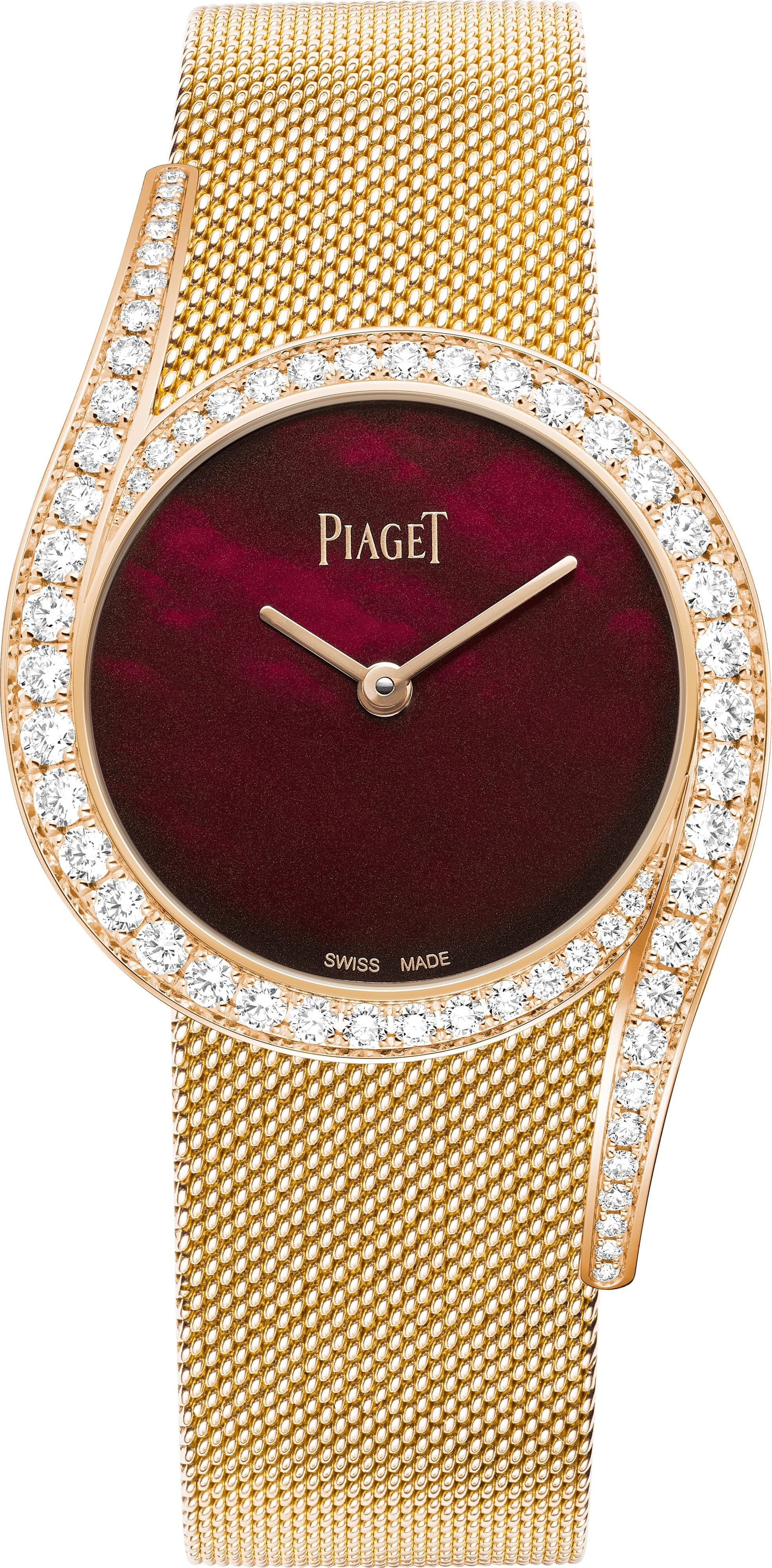 Đồng hồ Limelight Gala, 32 mm. Vỏ bằng vàng hồng 18K nạm 62 viên kim cương cắt giác brilliant (khoảng 1,65 ct). Mặt số khảm xà cừ và sơn mài màu đỏ tía đậm trong suốt. Dây đeo Milanese bằng vàng hồng 18K. Khóa cài nạm một viên kim cương cắt giác brilliant (khoảng 0,01 ct). Đồng hồ 501P1 sử dụng bộ máy cơ tự động. Chất liệu: Vàng hồng. Đá quý: Kim cương, xà cừ. Đường kính vỏ: 32 mm. Chất liệu dây đeo: Vàng. Màu dây đeo: Hồng. Hình dạng vỏ: Tròn. Độ dày vỏ: 8.91 mm. Màu mặt số: Đỏ rượu vang. Khả năng chống nước: 3 bar. Loại máy: Tự động lên dây. Hình dạng: Tròn. Chức năng máy: Phút, Giờ. Thời gian dự trữ năng lượng (giờ): 40. Tần số (vph): 28800. Tần số (Hz): 4. Đường kính (lines): 9. Đường kính (mm): 20.5 mm. Số lượng chân kính: 23. Độ dày (mm): 3.63 mm. Hoàn thiện máy: Vân tròn Côtes de Genève, Tấm vân tròn, Cầu vát cạnh, Ốc vít màu xanh lam, Quả lắc màu xám đá phiến, Quả lắc bằng vonfram.