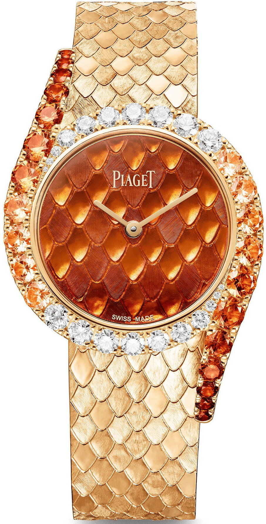 Chất liệu vỏ: Vàng hồng. Kích thước vỏ: 32mm. Mặt sau vỏ: Hở. Màu mặt số: Cam. Chất liệu mặt số: Men, Vàng. Hoàn thiện mặt số: Khắc. Chất liệu dây đeo: Vàng hồng. Loại khóa: Khóa gập. Bộ máy: Tự động. Caliber: 501P1. Thời gian dự trữ năng lượng: 43 giờ. Đính đá: 20 viên kim cương, 1,46 carat. Khả năng chống nước: Không xác định. Chức năng: Giờ, Phút.