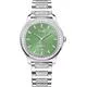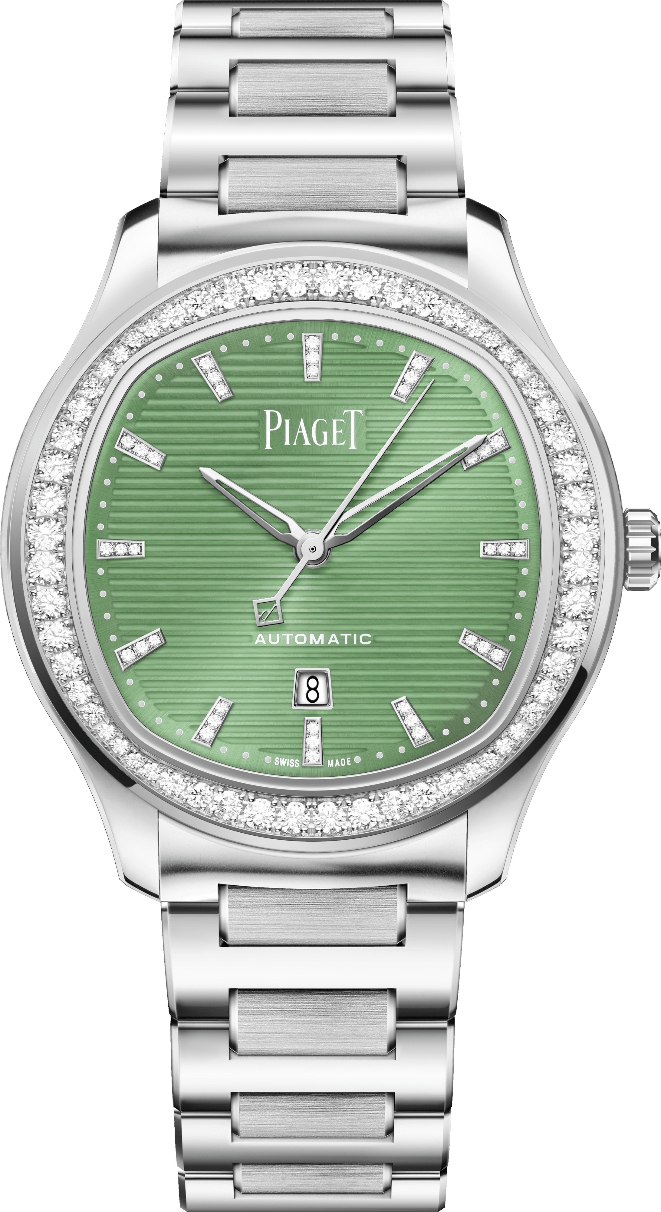 Đồng hồ Piaget Polo Date, 36 mm. Vỏ thép đính 60 viên kim cương cắt brilliant (khoảng 0,97 ct). Mặt số màu xanh lá cây nhạt với các vạch chỉ giờ bằng thép đính 36 viên kim cương cắt brilliant (khoảng 0,08 ct). Khóa gập. Nắp lưng bằng kính sapphire. Dây đeo có thể thay đổi. Bộ máy cơ tự động 500P1. Kim loại: Thép không gỉ. Chất liệu dây đeo: Thép. Màu dây đeo: Xám. Khóa gập: Thép. Khóa gập: Khóa gập ba. Kiểu dáng vỏ: Đệm. Đường kính vỏ: 36 mm. Độ dày vỏ: 8,8 mm. Màu mặt số: Xanh lá cây. Độ chống nước: 5 bar. Thông số kỹ thuật: Nắp lưng bằng kính sapphire. Kiểu máy: Tự động lên dây cót. Đá: Kim cương. Kiểu chuyển động Tự lên dây cót. Hình dạng Tròn. Chức năng chuyển động Phút, Giờ. Dự trữ năng lượng (tính theo giờ) 40. Tần số (vph) 28800. Tần số (Hz) 4. Đường kính (mm) 20,5 mm. Số lượng chân kính 24. Độ dày (mm) 3,63 mm. Hoàn thiện chuyển động Côtes de Genève tròn, Tấm vân tròn, Cầu vát, Vít màu xanh, Trọng lượng dao động khắc Huy hiệu Piaget, Trọng lượng dao động màu xám đá phiến