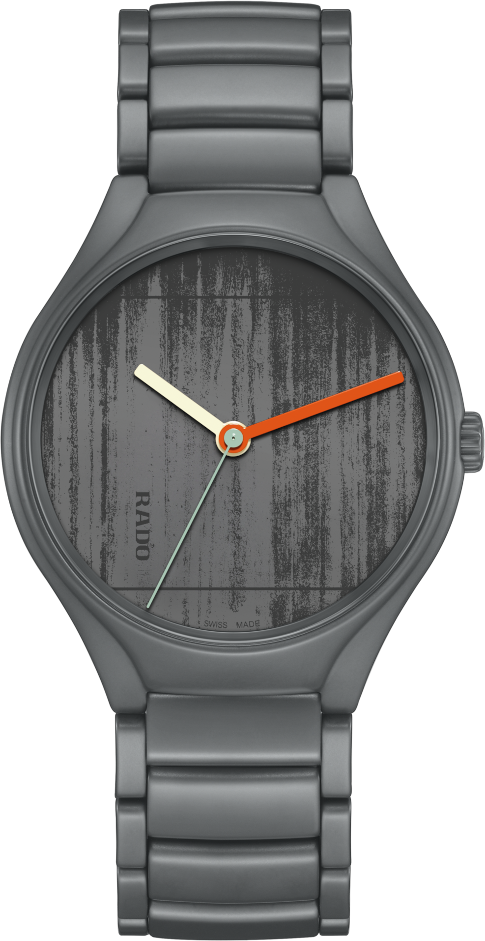 Vòng đeo tay bằng gốm công nghệ cao và vỏ nguyên khối màu xám đậm mờ (32010) phù hợp với màu sắc trong bảng màu Polychromie Architecturale của Le Corbusier, khẳng định vị thế bậc thầy về vật liệu của Rado. Chúng cũng đảm bảo sự thoải mái cho người đeo. Mặt kính sapphire cong và gốm công nghệ cao giúp đồng hồ luôn giữ được vẻ ngoài như mới. Lớp phủ chống phản chiếu trên cả hai mặt kính cho phép nhìn rõ mặt số, được khắc laser với hình ảnh trừu tượng về kết cấu bề mặt bê tông được thấy trên Trung tâm Nghệ thuật Thị giác Carpenter ở Cambridge, Hoa Kỳ. Logo Rado được đặt dọc ở vị trí 8 giờ. Được thiết kế để bổ sung cho nhau, kim đồng hồ có các màu khác trong bảng màu Polychromie Architecturale: trắng (32001), cam (4320S) và xanh lá cây (32041). Đồng hồ được trang bị bộ máy tự động Rado calibre R763, cung cấp khả năng dự trữ năng lượng 80 giờ và có lò xo cân bằng Nivachron™ chống từ tính. Được kiểm tra và hiệu chỉnh ở năm vị trí, bộ máy vượt qua các yêu cầu kiểm tra tiêu chuẩn để đảm bảo độ tin cậy và chính xác. Chất liệu vỏ: Gốm công nghệ cao. Đường kính vỏ: 40,0 mm. Loại máy: Tự động. Trọng lượng: 113g. Độ dày: 10,4 mm. Chất liệu vỏ: Gốm công nghệ cao. Núm vặn: Núm vặn, Gốm công nghệ cao. Mặt sau: Mặt sau bằng sapphire trong suốt, Titan. Màu mặt số: Xám. Bộ máy: R763. Thời gian dự trữ năng lượng: 80 giờ. Độ chính xác: Bộ máy được kiểm tra ở 5 vị trí. Bánh xe cân bằng: Lò xo tóc Nivachron™ chống từ tính. Màu dây đeo: Xám. Khóa gập 3 lần, Titan. Chống nước : 5ATM