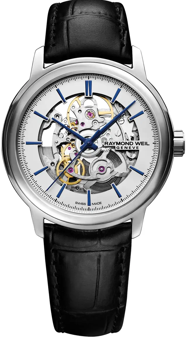 Vỏ thép không gỉ tông màu bạc với dây đeo bằng da màu đen. Vành thép không gỉ tông màu bạc cố định. Mặt số mạ điện màu bạc (trung tâm bộ xương) với các vạch chỉ giờ. Các vạch chỉ phút xung quanh vành ngoài. Kiểu mặt số: Analog. Bộ máy tự động với khả năng dự trữ năng lượng 38 giờ. Mặt kính sapphire chống trầy xước. Núm vặn kéo/đẩy. Mặt sau trong suốt. Hình dạng vỏ tròn, kích thước vỏ: 39,5 mm. Chốt tháo bằng nút nhấn. Chống nước ở độ sâu 50 mét / 165 feet. Chức năng: giờ, phút, giây. Dòng Maestro. Kiểu đồng hồ thể thao. Nhãn đồng hồ: Swiss Made. Đồng hồ nam tự động Raymond Weil Maestro 2815-STC-65001.