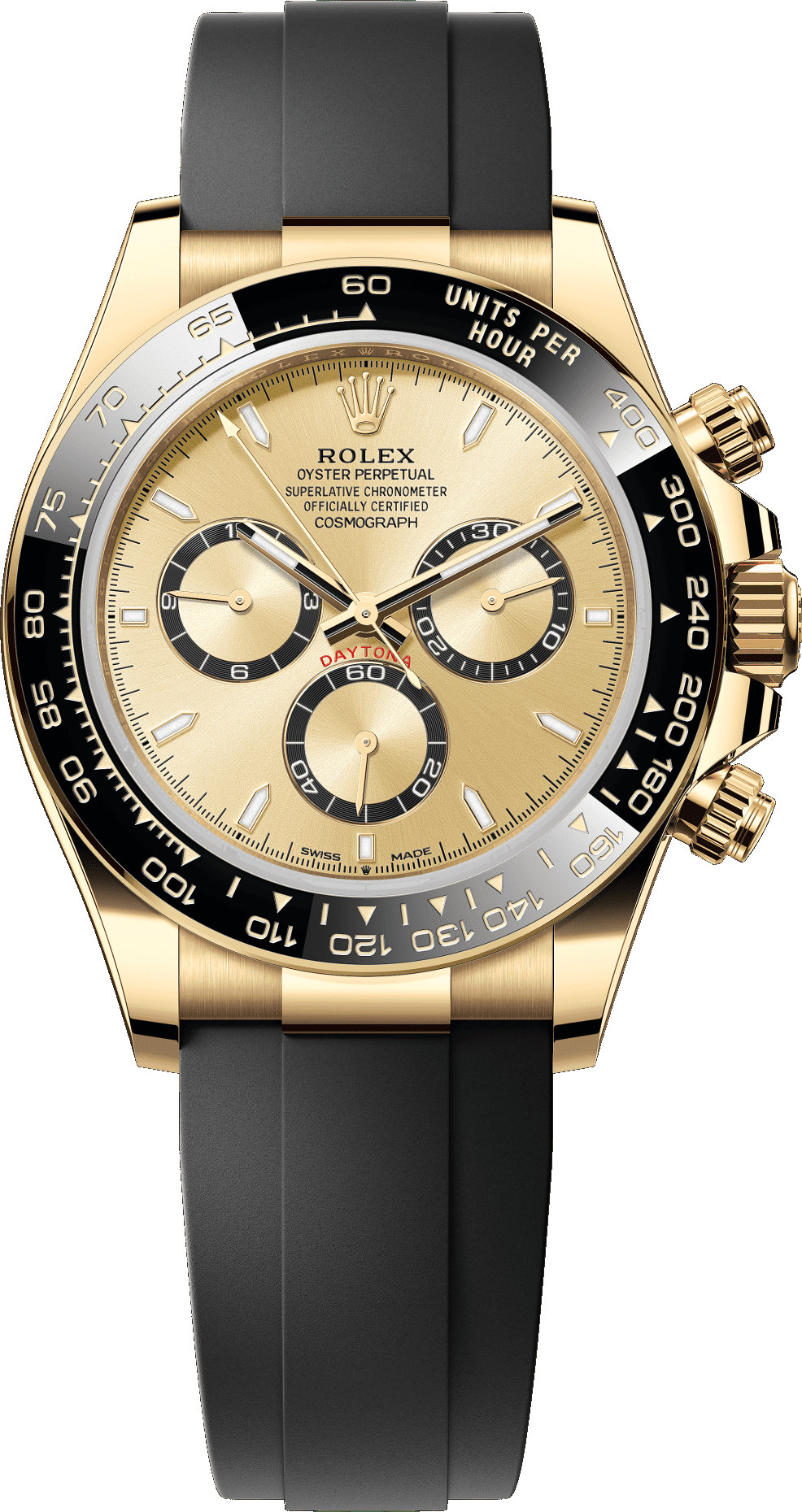 Các phiên bản Cosmograph Daytona bằng vàng 18 ct với vành đồng hồ Cerachrom có trên dây đeo Oysterflex. Được phát triển bởi Rolex và đã được cấp bằng sáng chế, dây đeo này kết hợp độc đáo giữa độ bền của một chiếc dây đeo kim loại với sự thoải mái của dây đeo đàn hồi.