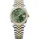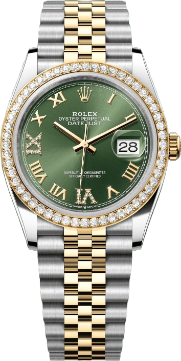 Mặt số này có ký tự La Mã VI và IX bằng vàng 18 kt, được đính 24 viên kim cương. Lớp hoàn thiện tia nắng tạo ra những phản chiếu ánh sáng tinh tế trên nhiều mặt số trong bộ sưu tập Oyster Perpetual. Lớp hoàn thiện này được tạo ra bằng kỹ thuật chải tinh xảo tạo ra các rãnh chạy ra ngoài từ tâm mặt số. Ánh sáng được khuếch tán đều dọc theo mỗi hình khắc, tạo ra ánh sáng tinh tế đặc trưng chuyển động tùy theo vị trí của cổ tay. Sau khi hoàn thiện tia nắng, màu sắc của mặt số được phủ bằng phương pháp lắng đọng hơi vật lý hoặc mạ điện. Một lớp vecni mỏng tạo nên diện mạo cuối cùng cho mặt số. Những người thợ đính đá quý, giống như những nhà điêu khắc, chạm khắc tinh xảo kim loại quý để tạo hình bằng tay cho chiếc ghế mà mỗi viên đá quý sẽ được đặt hoàn hảo. Với nghệ thuật và tay nghề của một thợ kim hoàn, viên đá được đặt và căn chỉnh tỉ mỉ với những viên khác, sau đó được cố định chắc chắn trong khung vàng hoặc bạch kim. Bên cạnh chất lượng vốn có của đá quý, một số tiêu chí khác góp phần tạo nên vẻ đẹp của việc đính đá quý Rolex: sự căn chỉnh chính xác về chiều cao của đá quý, hướng và vị trí của chúng, sự đều đặn, độ bền và tỷ lệ của việc đính đá cũng như sự hoàn thiện tinh xảo của kim loại. Một bản giao hưởng lấp lánh làm nổi bật chiếc đồng hồ và mê hoặc người đeo. Vàng được thèm muốn vì độ sáng bóng và vẻ quý phái của nó. Thép củng cố sức mạnh và độ tin cậy. Cùng nhau, chúng kết hợp hài hòa những đặc tính tốt nhất của chúng. Là một biểu tượng đích thực của Rolex, Rolesor đã xuất hiện trên các mẫu đồng hồ Rolex từ đầu những năm 1930 và được đăng ký nhãn hiệu vào năm 1933. Đây là một trong những trụ cột nổi bật của bộ sưu tập Oyster Perpetual. Thiết kế, phát triển và sản xuất dây đeo và khóa Rolex, cũng như các bài kiểm tra nghiêm ngặt mà chúng phải trải qua, đều liên quan đến công nghệ cao tiên tiến. Và, giống như tất cả các thành phần của đồng hồ, sự kiểm soát thẩm mỹ bằng mắt thường đảm bảo vẻ đẹp hoàn hảo. Jubilee, một dây đeo kim loại liên kết năm mảnh mềm mại và thoải mái, được thiết kế và chế tạo đặc biệt cho lần ra mắt Oyster Perpetual Datejust vào năm 1945. Vỏ mẫu. Oyster, 36 mm, Oystersteel, vàng vàng và kim cương. Kiến trúc Oyster Vỏ giữa nguyên khối, nắp lưng vặn chặt và núm vặn lên dây cót. Đường kính 36 mm. Vật liệu Rolesor vàng - sự kết hợp giữa Oystersteel và vàng vàng. Vành được đính kim cương. Núm vặn lên dây cót Vặn chặt, hệ thống chống thấm nước kép Twinlock. Mặt kính Sapphire chống xước, tròng kính Cyclops trên ngày. Chống nước ở độ sâu 100 mét / 330 feet. Bộ máy Perpetual, cơ học, tự lên dây cót. Calibre 3235, Nhà sản xuất Rolex. Độ chính xác -2/+2 giây/ngày, sau vỏ. Kim giờ, phút và giây ở giữa. Ngày tức thời với cài đặt nhanh. Dừng giây để cài đặt thời gian chính xác. Bộ dao động Dây tóc Parachrom màu xanh thuận từ. Bộ giảm xóc Paraflex hiệu suất cao. Lên dây cót tự động hai chiều bằng rotor Perpetual. Dự trữ năng lượng khoảng 70 giờ. Dây đeo Jubilee, khóa năm mảnh. Chất liệu: Yellow Rolesor - sự kết hợp giữa thép Oystersteel và vàng vàng. Khóa gập Oysterclase với khóa nối dài Easylink 5 mm tiện dụng. Mặt số: Xanh ô liu đính kim cương. Bộ phận đính đá: La Mã VI và IX bằng vàng 18kt, đính 24 viên kim cương. Chứng nhận Superlative Chronometer (chứng nhận COSC + Rolex sau khi hoàn thiện vỏ).