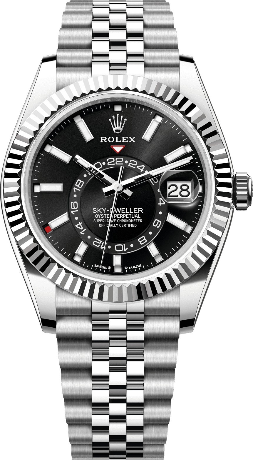 Một đặc điểm nổi bật: Một hình tam giác ngược màu đỏ cố định trên mặt số chỉ vào thời gian tham chiếu đã chọn – thời gian ở nhà hoặc nơi làm việc thường xuyên của người đi du lịch – trên đĩa 24 giờ lệch tâm. Chỉ cần nhìn thoáng qua, màn hình 24 giờ này phân biệt rõ ràng giờ ban ngày với giờ ban đêm ở múi giờ khác. Một hình chữ nhật màu đỏ đậm trong một trong 12 ô cửa sổ xung quanh mặt số cho biết tháng hiện tại, một đặc điểm nổi bật của lịch năm Saros. Cơ chế khéo léo này giúp cuộc sống của người đeo đồng hồ trở nên đơn giản hơn, họ không còn cần phải nghĩ đến việc điều chỉnh ngày vào cuối tháng 30 ngày nữa. Lịch năm hiển thị ngày chính xác trong suốt cả năm. Chỉ cần điều chỉnh một lần – vào ngày 1 tháng 3 (tháng 2 chỉ có 28 hoặc 29 ngày). Ngày được kết nối với giờ địa phương và tự động thay đổi theo múi giờ địa phương của người đi du lịch. Vòng bezel khía của Rolex là một dấu ấn khác biệt. Ban đầu, các đường rãnh trên vành bezel Oyster có mục đích chức năng: chúng dùng để vặn vành bezel vào vỏ đồng hồ, giúp đảm bảo khả năng chống nước. Do đó, chúng giống hệt với các đường rãnh trên nắp lưng đồng hồ, cũng được vặn vào vỏ để chống nước, bằng các dụng cụ chuyên dụng của Rolex. Theo thời gian, các đường rãnh trở thành một yếu tố thẩm mỹ, một đặc điểm nhận diện thực sự của Rolex. Ngày nay, vành bezel có rãnh là một dấu ấn khác biệt, luôn luôn bằng vàng. Đồng hồ Sky-Dweller được trang bị cơ chế tương tác giữa vành bezel xoay, núm vặn và bộ máy: hệ thống Ring Command, cho phép người dùng chọn từng chức năng của đồng hồ và thiết lập chúng một cách dễ dàng, nhanh chóng và an toàn. Vàng được ưa chuộng vì độ sáng bóng và vẻ quý phái. Thép tăng cường độ bền và độ tin cậy. Cả hai chất liệu này kết hợp hài hòa những đặc tính tốt nhất của mình. Là một dấu ấn đặc trưng của Rolex, Rolesor đã xuất hiện trên các mẫu đồng hồ Rolex từ đầu những năm 1930 và được đăng ký nhãn hiệu vào năm 1933. Đây là một trong những trụ cột nổi bật của bộ sưu tập Oyster Perpetual. Mềm mại và thoải mái, vòng đeo tay kim loại năm mắt xích này được chế tạo đặc biệt cho Oyster Perpetual Datejust, ra mắt năm 1945. Vòng đeo tay Jubilee trên những chiếc đồng hồ này được trang bị khóa gập Oysterclasp và có mắt xích mở rộng Easylink tiện lợi, do Rolex phát triển, cho phép người đeo dễ dàng điều chỉnh độ dài vòng đeo tay khoảng 5 mm. Vòng đeo tay cũng bao gồm các miếng chèn gốm được cấp bằng sáng chế – do thương hiệu thiết kế – bên trong các mắt xích để tăng cường độ linh hoạt trên cổ tay và độ bền. Cấu trúc Oyster: Vỏ giữa nguyên khối, nắp lưng và núm vặn có ren. Đường kính 42 mm. Chất liệu: White Rolesor - sự kết hợp giữa thép Oystersteel và vàng trắng. Vòng bezel: Có rãnh, xoay hai chiều, vòng điều khiển Rolex. Núm vặn: Có ren, hệ thống chống nước kép Twinlock. Mặt kính: Sapphire chống trầy xước, thấu kính Cyclops trên ô hiển thị ngày. Khả năng chống nước: Chống nước đến 100 mét / 330 feet. Bộ máy: Cơ khí vĩnh cửu, tự động lên dây, hai múi giờ, lịch năm. Calibre 9002, sản xuất bởi Rolex. Độ chính xác: -2/+2 giây/ngày, sau khi lắp ráp. Chức năng: Kim giờ, phút và giây ở trung tâm. Hiển thị 24 giờ trên đĩa lệch tâm. Múi giờ thứ hai. Lịch năm tức thời ở vị trí 3 giờ và cài đặt ngày nhanh. Hiển thị tháng thông qua 12 ô cửa sổ xung quanh chu vi mặt số. Chức năng dừng giây để cài đặt thời gian chính xác. Bộ dao động: Lò xo tóc Parachrom màu xanh lam từ tính. Bộ giảm xóc Paraflex hiệu suất cao. Cơ chế lên dây: Tự động lên dây hai chiều thông qua rôto vĩnh cửu. Thời gian dự trữ năng lượng: Khoảng 72 giờ. Dây đeo: Jubilee, năm mắt xích. Chất liệu: Thép Oystersteel. Khóa: Khóa gập Oysterclasp với mắt xích mở rộng Easylink 5 mm tạo sự thoải mái. Mặt số: Màu đen sáng. Chi tiết: Màn hình Chromalight dễ đọc với khả năng phát quang màu xanh lam bền lâu. Chứng nhận: Đồng hồ bấm giờ siêu hạng (chứng nhận COSC + Rolex sau khi lắp ráp).