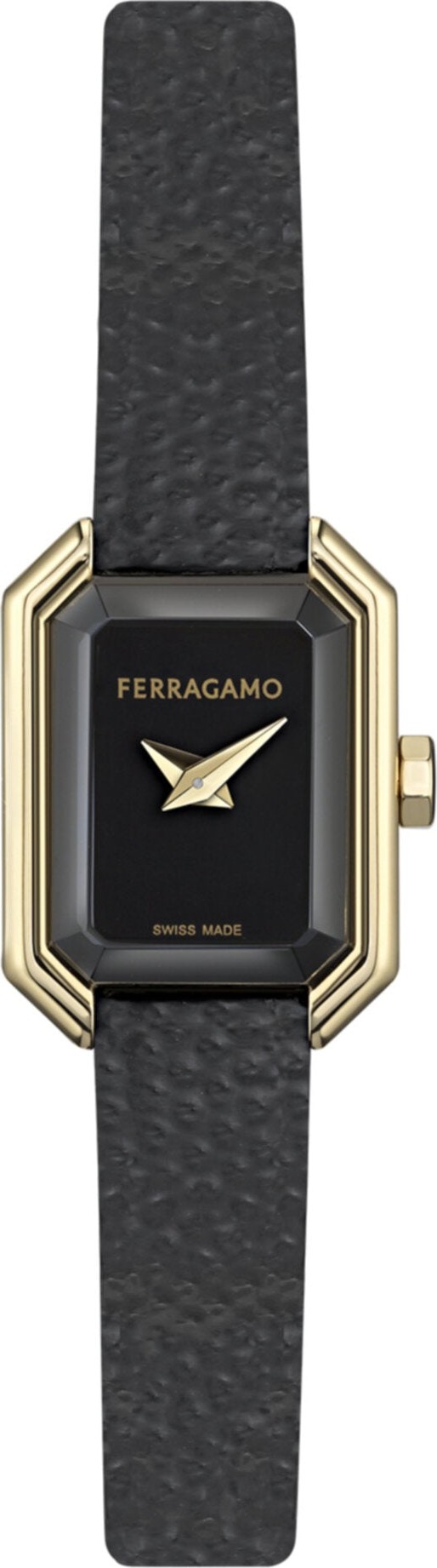 Ferragamo Crystal Petite là một tuyệt tác đồng hồ tinh tế, xóa nhòa ranh giới giữa chế tác đồng hồ và trang sức. Với vỏ hình chữ nhật nhỏ nhắn, thanh lịch và dây đeo mắt xích được đánh bóng, chiếc đồng hồ toát lên vẻ sang trọng vượt thời gian và sự quyến rũ xa hoa. Mặt số tối giản và mặt kính đa giác càng làm nổi bật vẻ đẹp như một viên ngọc quý. Vỏ mạ vàng IP 15x20mm. Dây đeo da bê đen. Mặt số tráng men đen. Chống nước 3 ATM. Khóa Ardillon. Bộ máy thạch anh 2 kim sản xuất tại Thụy Sĩ.