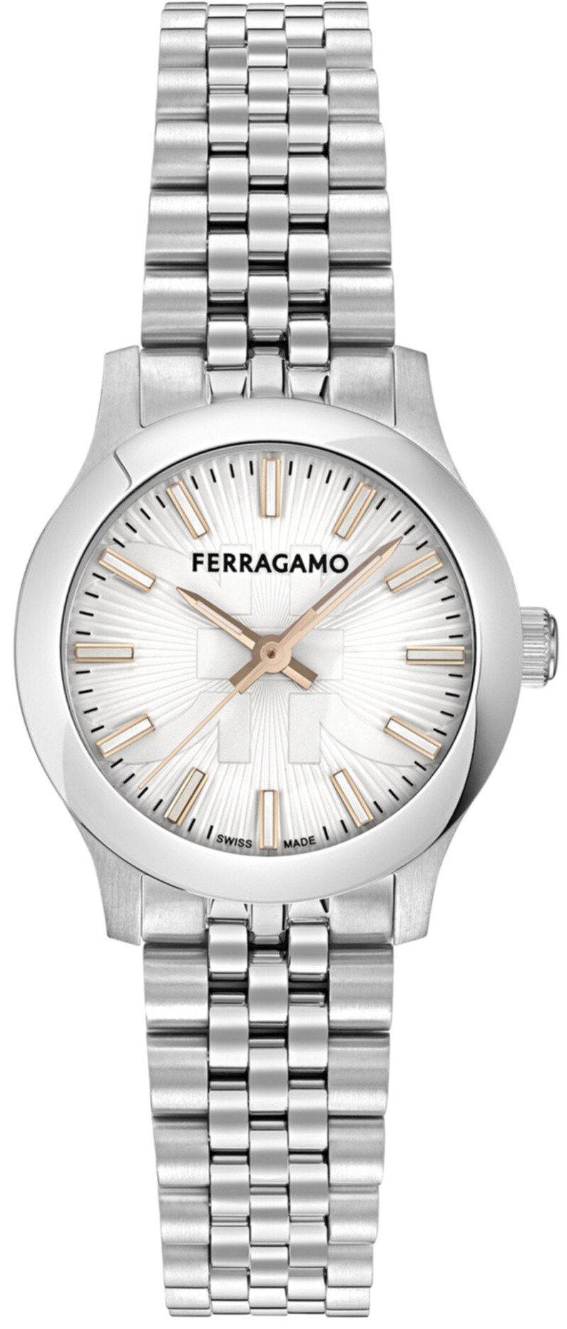Đồng hồ Ferragamo Duo kết hợp sự tinh tế vượt thời gian với vẻ đẹp hiện đại. Được chế tác từ thép không gỉ đánh bóng với khóa gập, chiếc đồng hồ đa năng này là biểu tượng của sự sang trọng và chính xác bền bỉ. Vỏ thép không gỉ 28mm. Dây đeo thép không gỉ. Mặt số bạc Guilloche. Chống nước 3 ATM. Khóa gập. Bộ máy thạch anh 3 kim sản xuất tại Thụy Sĩ.