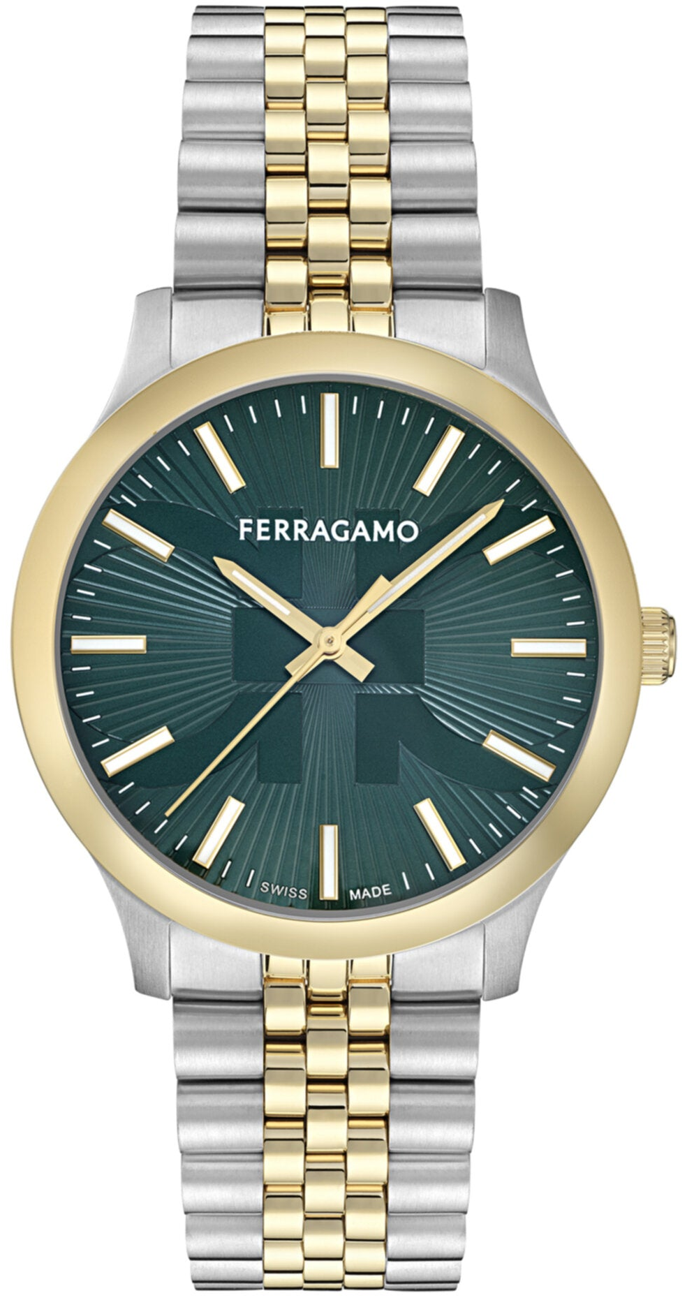 Đồng hồ Ferragamo Duo kết hợp sự tinh tế vượt thời gian với vẻ đẹp hiện đại. Được chế tác từ thép không gỉ đánh bóng với khóa gập, chiếc đồng hồ đa năng này là biểu tượng của sự sang trọng và chính xác bền bỉ. Vỏ hai tông màu 40mm. Dây đeo hai tông màu. Mặt số Guilloche màu xanh lá cây. Chống nước 5 ATM. Khóa gập. Bộ máy thạch anh 3 kim sản xuất tại Thụy Sĩ.