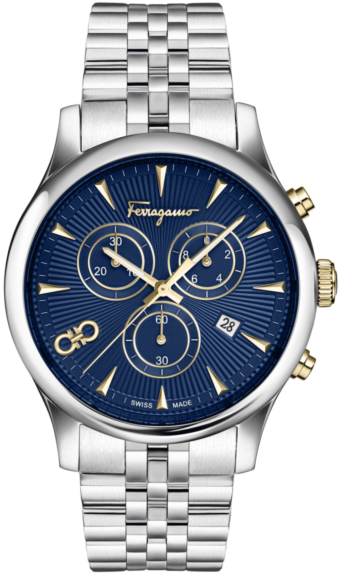 Ferragamo Duo Chrono là một chiếc đồng hồ cổ điển tuyệt vời được tái thiết kế cho mùa này với các phiên bản màu sắc mới. Chiếc đồng hồ này có vỏ 42mm, mặt số guillochè với chức năng chronograph và biểu tượng Gancini kép ở vị trí 8 giờ. Vỏ thép không gỉ 42mm. Dây đeo thép không gỉ. Mặt số guillochè màu xanh lam. Chống nước 5 ATM. Khóa gập. Bộ máy thạch anh chronograph ngày sản xuất tại Thụy Sĩ.