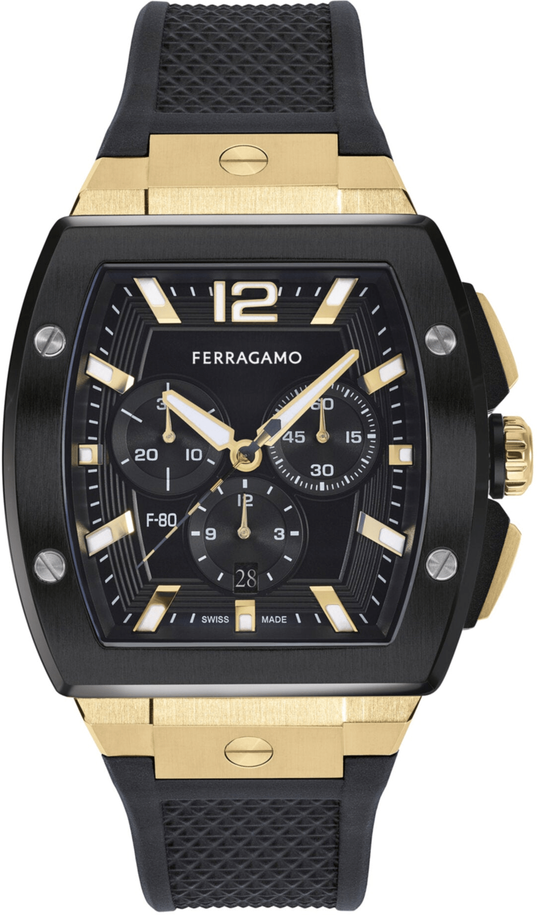 Chiếc F-80 Tonneau Chrono mới hội tụ trọn vẹn tinh hoa của phân khúc đồng hồ thể thao sang trọng của Ferragamo. Bắt đầu từ hình dáng vỏ máy, hoàn toàn phù hợp với xu hướng hiện tại, chiếc đồng hồ vẫn giữ nguyên những nét đặc trưng của bộ sưu tập F-80: các ốc vít trên vòng trên cùng, tại vị trí 12H và 6H, cũng như sự tỉ mỉ đến từng chi tiết như vỏ giữa bằng nhôm anodized. Mặt số guillochè được hoàn thiện bằng họa tiết tia mặt trời và bao quanh bộ máy chronograph với các mặt số phụ, vạch chỉ giờ và kim phát sáng. Vỏ thép không gỉ IP màu đen với dây đeo silicon màu đen. Vành bezel thép không gỉ IP màu đen cố định. Mặt số màu đen với kim màu vàng và vạch chỉ giờ bằng chữ số Ả Rập. Chữ số Ả Rập đánh dấu vị trí 12 giờ. Vạch chỉ phút xung quanh vành ngoài. Kiểu mặt số: Analog. Kim và vạch chỉ giờ phát quang. Hiển thị ngày ở vị trí 6 giờ. Chronograph - ba mặt số phụ hiển thị: 60 giây, 30 phút và 12 giờ. Bộ máy thạch anh. Mặt kính sapphire chống trầy xước. Nắp lưng chắc chắn. Kiểu dáng vỏ Tonneau, kích thước vỏ: 41,8 mm. Khóa cài. Chống nước ở độ sâu 100 mét / 330 feet.