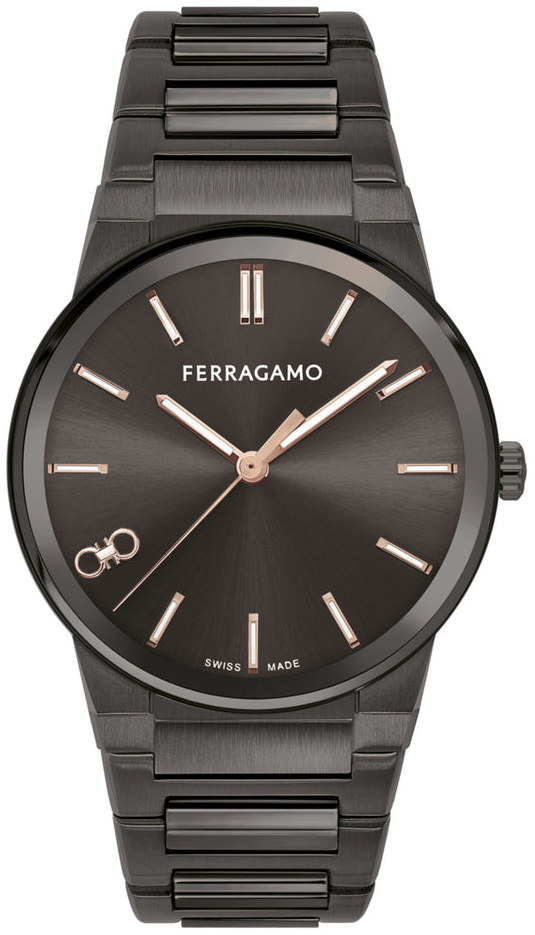 Mẫu Ferragamo Infinity Sapphire mới: sự phản chiếu và khúc xạ đầy quyến rũ làm nổi bật vẻ lấp lánh của đá sapphire, nâng tầm chiếc đồng hồ lên một đẳng cấp tinh tế chưa từng có. Vỏ 41mm mạ IP Gunmetal. Dây đeo mạ IP Gunmetal. Mặt số màu xám tia nắng. Chống nước 5 ATM. Khóa gập. Bộ máy thạch anh 3 kim sản xuất tại Thụy Sĩ.