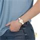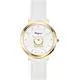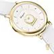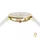 Vỏ vàng vàng IP 36mm. Dây da bê trắng. Mặt số Guilloche trắng. 5 ATM. Khóa Ardillon. Bộ máy thạch anh 2 kim sản xuất tại Thụy Sĩ