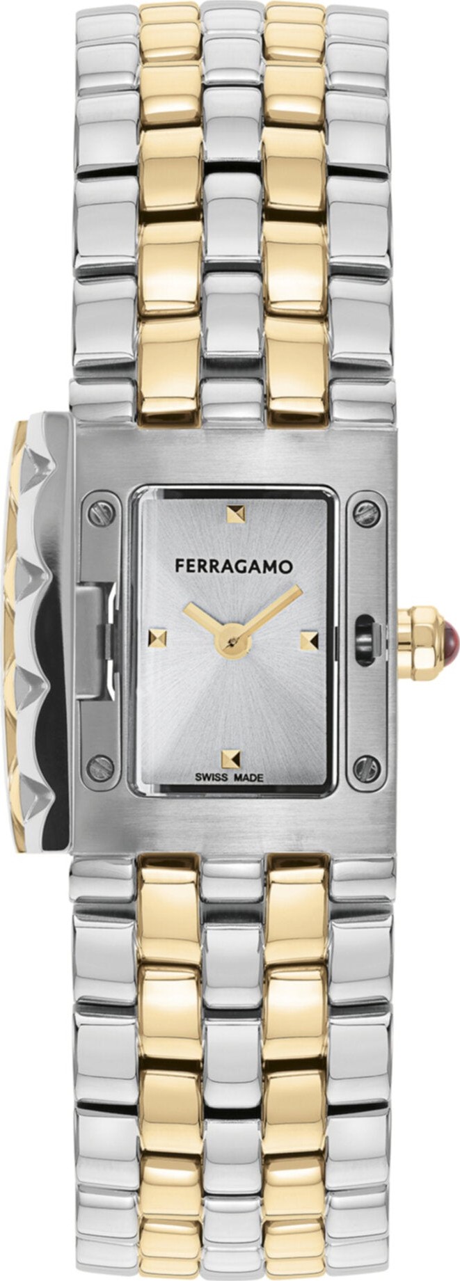 Đồng hồ bí mật Ferragamo: sự kết hợp giữa vẻ thanh lịch và sự bí ẩn. Chiếc đồng hồ tinh tế này che giấu bản chất thực sự của nó cho đến khi chốt ẩn được mở ra, để lộ mặt số bí mật. Trải nghiệm sự kỳ diệu của đồng hồ bí mật Ferragamo, nơi vẻ đẹp hòa quyện hoàn hảo với chức năng. Vỏ hai tông màu 18,5x30mm. Dây đeo hai tông màu. Mặt số bạc chải tia. Chống nước 3 ATM. Khóa gập. Bộ máy thạch anh 2 kim sản xuất tại Thụy Sĩ.