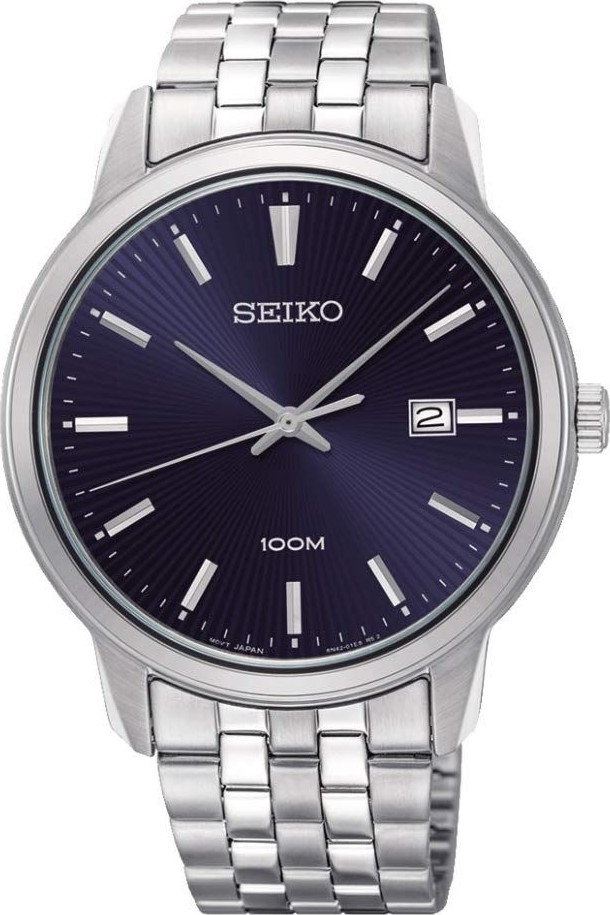 Vỏ thép không gỉ với dây đeo bằng thép không gỉ. Vành bezel cố định bằng thép không gỉ. Mặt số màu xanh lam với kim và vạch chỉ giờ màu bạc. Vạch chỉ phút xung quanh vành ngoài. Kiểu mặt số: Analog. Hiển thị ngày ở vị trí 3 giờ. Bộ máy thạch anh Seiko caliber 6N42. Mặt kính Hardlex chống trầy xước. Núm vặn kéo/đẩy. Nắp lưng liền khối. Hình dáng tròn. Kích thước vỏ: 41 mm. Độ dày vỏ: 9 mm. Chiều rộng dây đeo: 20 mm. Khóa gập. Chống nước ở độ sâu 100 mét / 330 feet. Chức năng: ngày, giờ, phút, giây.