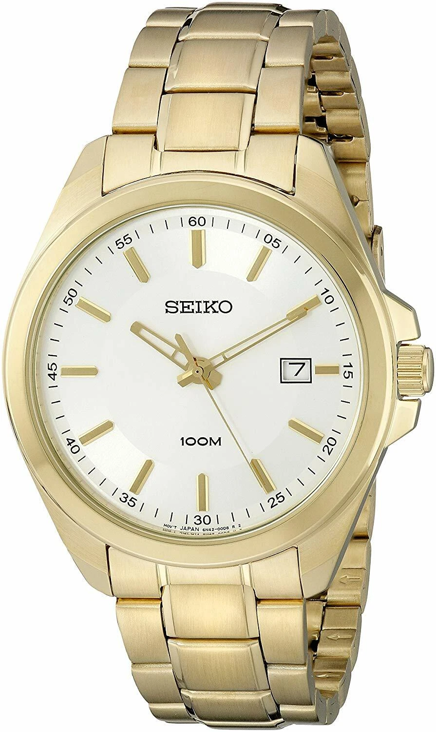 Vỏ và dây đeo bằng thép không gỉ tông vàng vàng. Vành bezel cố định tông vàng vàng. Mặt số màu bạc với kim và vạch chỉ giờ tông vàng vàng. Vạch chỉ phút xung quanh vành ngoài. Kiểu mặt số: Analog. Hiển thị ngày ở vị trí 3 giờ. Bộ máy thạch anh Seiko caliber 6N42. Kính Hardlex chống trầy xước. Núm vặn kéo/đẩy. Nắp lưng liền khối. Kiểu dáng tròn. Kích thước vỏ: 41 mm. Độ dày vỏ: 9 mm. Độ rộng dây đeo: 22 mm. Khóa cài. Khả năng chống nước ở độ sâu 100 mét / 330 feet.