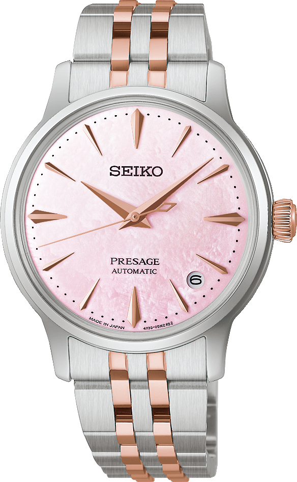 Chiếc đồng hồ này có mặt số khảm xà cừ với hiệu ứng chuyển màu dọc màu hồng nhẹ nhàng, tinh tế, gợi nhớ đến hoa anh đào. Bề mặt sáng bóng của xà cừ trắng thay đổi vẻ đẹp tùy thuộc vào góc nhìn, gợi lên sự trong suốt lung linh của một ly cocktail đang nhẹ nhàng xoay tròn trong ly. Các điểm nhấn màu vàng hồng tạo thêm sự ấm áp cho kim, vạch chỉ giờ và núm vặn, và được phản chiếu một cách tinh tế trên dây đeo.