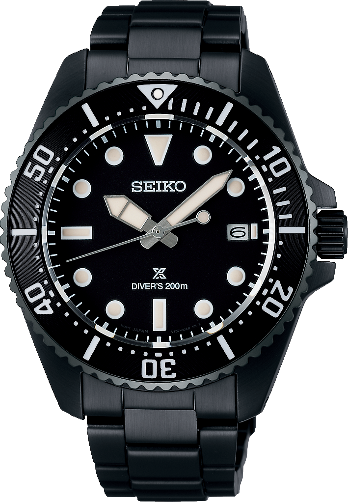 Vỏ và dây đeo bằng thép không gỉ màu đen. Vòng bezel xoay một chiều bằng thép không gỉ màu đen. Mặt số màu đen với kim và vạch chỉ giờ màu bạc. Vạch chỉ phút xung quanh viền ngoài. Kim và vạch chỉ giờ phát quang. Hiển thị ngày ở vị trí 3 giờ. Bộ máy Seiko Caliber V157 eco-drive. Mặt kính sapphire chống trầy xước. Núm vặn. Nắp lưng kín. Hình dạng vỏ tròn, kích thước vỏ: 41 mm, độ dày vỏ: 11,3 mm. Chiều rộng dây đeo: 20 mm. Khóa gập có chốt an toàn. Chống nước ở độ sâu 200 mét / 660 feet. Chức năng: ngày, giờ, phút, giây, năng lượng mặt trời. Dòng Prospex Solar. Kiểu đồng hồ lặn.