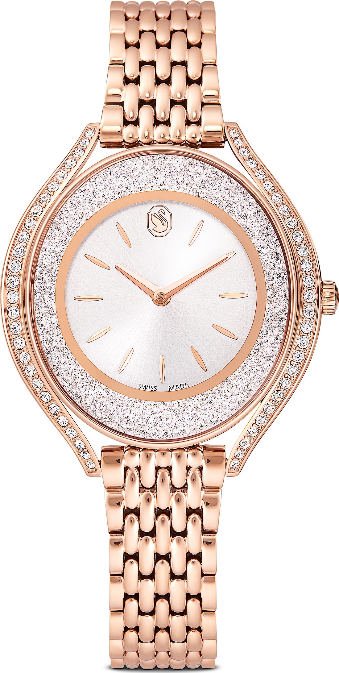 Chiếc đồng hồ Crystalline với đường cong mềm mại này khéo léo kết hợp giữa sự thanh lịch và chức năng. Khoảng 1.380 viên pha lê được đính xung quanh vỏ đồng hồ, được chế tác với lớp hoàn thiện mạ vàng hồng. Thiết kế tinh tế được hoàn thiện với dây đeo kim loại, mặt số màu bạc ánh nắng và hình thiên nga Swarovski ở vị trí 12 giờ. Chiếc đồng hồ sản xuất tại Thụy Sĩ này có khả năng chống nước đến 50m. Màu sắc: Vàng hồng. Chất liệu: Lớp hoàn thiện mạ vàng hồng. Kích thước: Kích thước vỏ: 40 x 35 mm, Độ dày vỏ: 9 mm, Chiều dài dây đeo (tối thiểu - tối đa): 16,5 - 18,5 cm, Chiều rộng dây đeo: 1,4 cm. Bộ sưu tập: Crystalline Aura