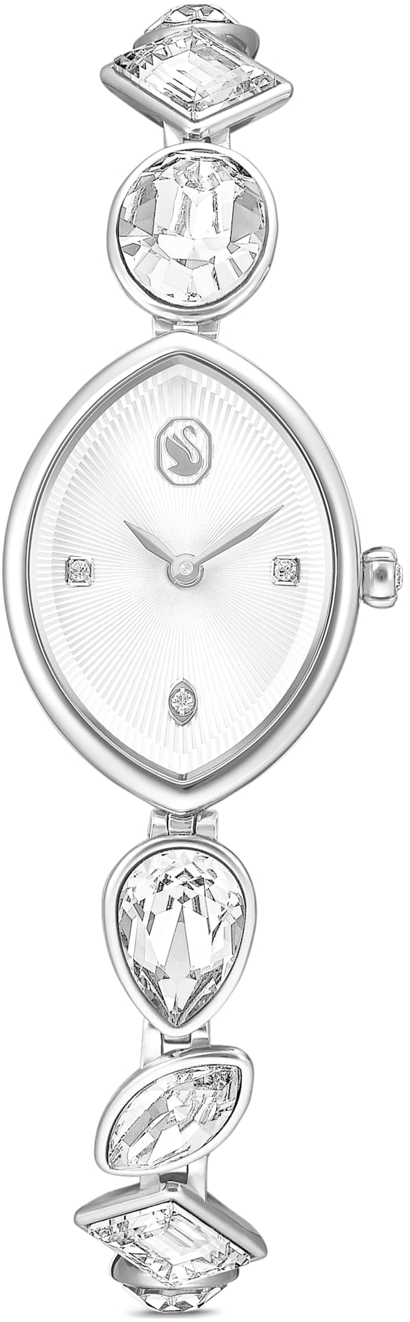 Với sự kết hợp đầy mê hoặc của các hình khối, chiếc đồng hồ Swarovski này lấy cảm hứng từ bộ sưu tập trang sức Gema. Vỏ hình quả hạnh được chế tác từ thép không gỉ và có mặt số guilloché với ba vạch chỉ giờ bằng pha lê cùng biểu tượng thiên nga thanh lịch. Trên cổ tay, chiếc đồng hồ nổi bật với dây đeo có thể điều chỉnh được, đính tám viên pha lê khác nhau với nhiều kiểu cắt. Có khả năng chống nước đến 50m, đây là một cách thú vị để thêm chút hình học rạng rỡ vào phong cách của bạn. Bộ sưu tập: Gema. Kích thước vỏ: 1 x 3/4 inch. Độ dày vỏ: 1/4 inch. Chiều dài dây đeo có thể đeo (tối thiểu - tối đa): 6 1/2 - 7 1/4 inch. Chiều rộng dây đeo: 3/8 inch. Chất liệu: Pha lê, Thép không gỉ. Màu sắc: Tông màu bạc. Loại khóa: Khóa gập. Chất liệu dây đeo: Kim loại. Cơ chế: Thạch anh.