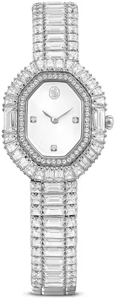 Chiếc đồng hồ sáng tạo này là một sáng tạo độc nhất vô nhị kết hợp thiết kế đặc trưng với sự tinh thông về ánh sáng. Được chế tác với sự khéo léo đích thực, chiếc đồng hồ này được lấy cảm hứng từ dòng trang sức Matrix và có vỏ bằng thép không gỉ 13 x 18 mm. Vành đồng hồ được thiết kế theo hình bát giác đặc trưng của Nhà mốt và được đính kết hợp tuyệt đẹp 78 viên pha lê tròn cắt lạ mắt và Swarovski Zirconia. Điều này tạo nên một khung hình rạng rỡ cho mặt số tia nắng tối giản, hiển thị ba vạch chỉ giờ bằng pha lê và logo thiên nga một cách thanh lịch. Một viên pha lê duy nhất cũng được đặt trong núm điều chỉnh, trong khi quanh cổ tay, sự sang trọng được nâng cao hơn nữa bởi một vòng đeo tay rạng rỡ được đính 72 viên Swarovski Zirconia. Chiếc đồng hồ này có khả năng chống nước ở độ sâu 50m và tượng trưng cho sự sang trọng hiện đại của Swarovski ở mức tinh tế nhất. Bộ sưu tập: Matrix. Kích thước vỏ: 1 1/8 x 7/8 inch. Độ dày vỏ: 1/4 inch. Chiều dài đeo dây đeo (tối thiểu - tối đa): 4 7/8 - 7 1/2 inch. Chiều rộng dây đeo: 1/2 inch. Chất liệu: Pha lê, Thép không gỉ, Zirconia. Màu sắc: Tông bạc. Kiểu khóa: Khóa bướm. Chất liệu dây đeo: Pha lê. Bộ máy: Thạch anh.