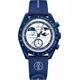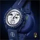 Chiếc đồng hồ bấm giờ này có vỏ, núm điều chỉnh và nút bấm Bioceramic màu xanh nước biển, kết hợp với dây đeo cao su xanh nước biển đồng bộ và vòng lặp Bioceramic. Đồng hồ có mặt số opaline màu trắng với các vạch chỉ giờ được phủ Super-LumiNova® hạng A (phát quang màu xanh lá cây). Ở vị trí 10 giờ, chỉ báo pha trái đất hiển thị Trái đất với đại dương phát sáng màu xanh dưới tia UV. Bên dưới chỉ báo pha trái đất là hình minh họa Snoopy và Woodstock trên Mặt trăng, đang kinh ngạc trước cảnh tượng mê hoặc của Trái đất. Hình minh họa thể hiện một cụm từ chỉ xuất hiện dưới tia UV. Ở mặt số phụ 2 giờ là chỉ báo pha mặt trăng với hai mặt trăng tròn rạng rỡ, cả hai đều được phủ Moonshine™ Gold của OMEGA. Một trong hai mặt trăng được thiết kế theo phong cách đặc trưng của thế giới Snoopy, trong khi mặt trăng còn lại được tái hiện thành mặt trăng bị hải ly cắn. Nắp pin được trang trí bằng thiết kế lấy cảm hứng từ Trái đất, trong khi dây đeo cao su xanh nước biển có khóa VELCRO® thêm một chút phong cách phi hành gia. Mặt số của mỗi chiếc đồng hồ trong bộ sưu tập này đều mang thương hiệu OMEGA X Swatch, logo Speedmaster biểu tượng và logo MoonSwatch. Điểm chung của tất cả các mẫu đồng hồ là cấu trúc kính sinh học hình hộp, chữ "S" khắc ở giữa mặt kính tượng trưng cho logo Swatch, họa tiết tròn tinh xảo trên vành ngoài mặt số và các mặt số phụ lõm, cấu trúc vấu sắc nét và mượt mà, và tất nhiên là cảm giác gốm sinh học độc đáo. Các vạch chỉ giờ, kim giờ, kim phút và đầu kim giây chronograph đều được phủ lớp Super-LumiNova® hạng A, cho khả năng phát sáng hoàn hảo trong bóng tối (phát quang xanh lục). Chất liệu vỏ: vỏ gốm sinh học xanh navy, núm vặn và nút bấm. Đường kính vỏ: 42,00 mm. Độ dày vỏ: 13,75 mm. Khoảng cách giữa vấu và vấu: 47,30 mm. Bộ máy thạch anh: chronograph (chỉ giây) với chỉ báo pha mặt trăng và pha trái đất. Khả năng chống nước: 3 bar. Dây đeo: dây cao su xanh navy với khóa VELCRO®, vòng lặp gốm sinh học xanh navy