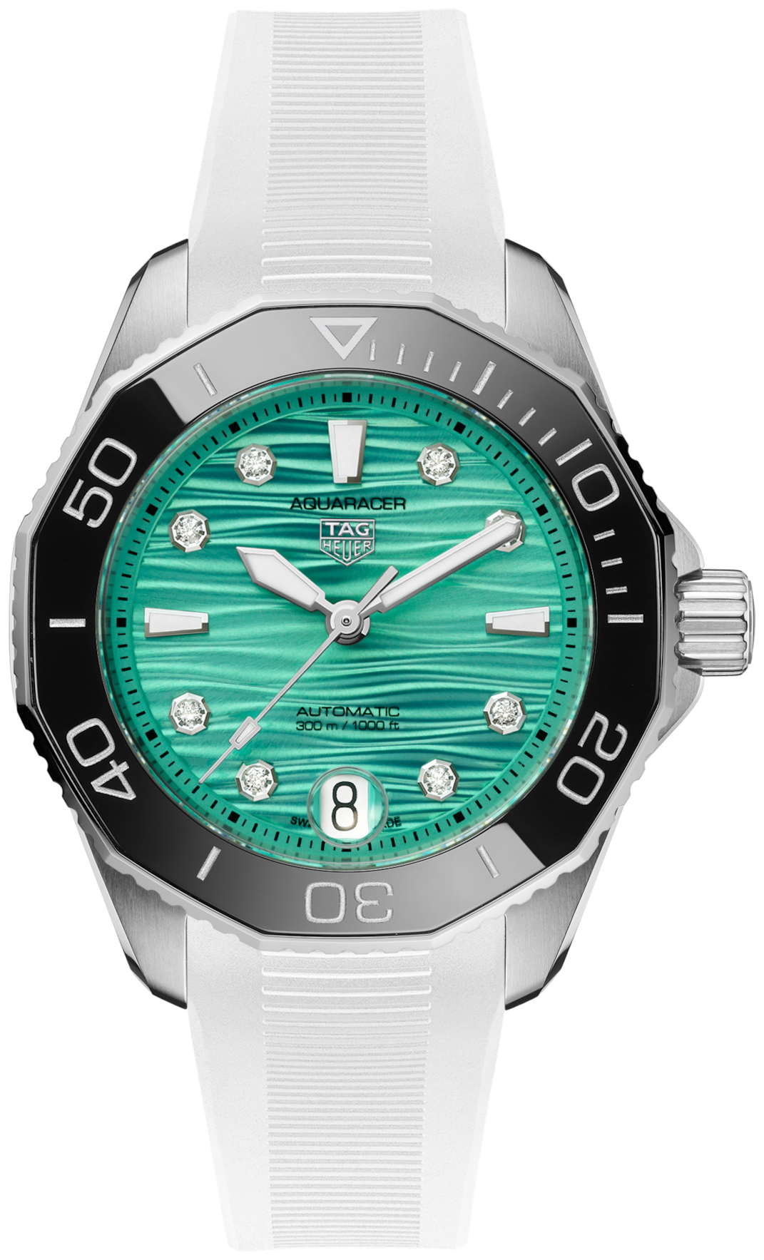 Với màu sắc nổi bật, chiếc đồng hồ TAG Heuer Aquaracer này thể hiện đẳng cấp của một chiếc đồng hồ lặn mạnh mẽ, đồng thời gợi lên màu sắc của biển cả. Dây đeo màu trắng dễ dàng điều chỉnh tạo nên sự tương phản hoàn hảo với mặt số màu xanh ngọc đậm. Mặt số màu xanh ngọc thu hút ánh nhìn nhờ họa tiết lượn sóng và tám viên kim cương VS cắt brilliant 1,40mm (0,078 ct) ở các vạch chỉ giờ. TAG Heuer Aquaracer là một chiếc đồng hồ lặn thực thụ, với kích thước hoàn hảo 36mm. Vòng bezel bằng gốm đen và vỏ thép được chế tạo để bền bỉ hơn. Kết hợp giữa cấu trúc kỹ thuật và hệ thống điều chỉnh tinh tế, dây đeo cao su màu trắng mang lại sự thoải mái tối ưu. Bộ máy: Calibre 5 Tự động. Cơ chế hoạt động: Tự động. Dự trữ năng lượng (giờ): 38. Tần số dao động: 28.800 (4 Hz). Chức năng: Giờ, Phút, Giây, Ngày. Kích thước vỏ: 36 mm. Độ dày: 11.4 mm. Khoảng cách giữa các càng: 17.4 mm. Khả năng chống nước: 300 m. Vỏ: Thép chải mịn/đánh bóng. Vòng bezel: Vòng bezel xoay. Chất liệu vòng bezel: Thép & gốm. Mặt sau vỏ: Trơn - Thép. Chất liệu dây đeo: Cao su. Màu sắc: Trắng. Hoàn thiện: Phun cát. Khóa: Khóa gập nút bấm - Thép đánh bóng. Hoàn thiện mặt số: Sơn mài. Màu sắc: Xanh lá cây. Vạch chỉ giờ: Gắn nổi. Trọng lượng kim cương trên mặt số: 0.077 carat. Số lượng kim cương trên mặt số: 8