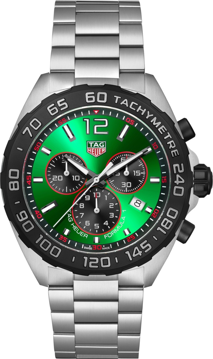 Tinh thần táo bạo, thiết kế nổi bật. Được trang trí bằng mặt số màu xanh lá cây rực rỡ, chiếc đồng hồ TAG Heuer Formula 1 tràn đầy năng lượng này là lời tri ân táo bạo dành cho những người thách thức không biết sợ hãi trên đường đua. Kết hợp sức mạnh và tính linh hoạt, nó là minh chứng cho những ai dám vượt lên. Caliber Quartz. Chức năng Giờ, Phút, Giây, Chronograph: 1/10 giây, giây, bộ đếm 30 phút, Ngày. Kích thước 43 mm. Độ dày 12,4 mm. Khoảng cách vấu 21,5 mm. Khả năng chống nước 200 m. Vỏ Thép đánh bóng mịn. Núm điều chỉnh bằng thép phủ PVD màu đen vặn chặt. Nắp lưng trơn - Thép. Chất liệu dây đeo Thép. Hoàn thiện đánh bóng mịn. Khóa gập Khóa bấm - Thép. Màu xanh lá cây