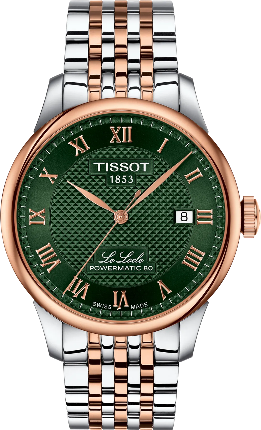 Bộ sưu tập Le Locle lần đầu tiên được giới thiệu vào năm 2003 nhằm kỷ niệm 150 năm thành lập Tissot. Chiếc đồng hồ này là một phần của lịch sử, thể hiện tinh thần đổi mới đã định hình thương hiệu trong suốt hơn một thế kỷ. Mẫu đồng hồ này sở hữu mặt số màu xanh lá và được trang bị dây đeo có thể thay đổi với cơ chế tháo lắp nhanh. Tất cả các mẫu Le Locle đều có mặt số guilloché Clous de Paris tinh xảo với họa tiết kim tự tháp nhỏ – một chi tiết tạo nên sự khác biệt. Sự kết hợp giữa các bề mặt đánh bóng và chải xước trên các mắt dây tạo nên nhịp điệu thị giác cuốn hút, bắt sáng theo từng chuyển động. Chiếc đồng hồ mang đậm nét quyến rũ của di sản Thụy Sĩ, với tên gọi “Le Locle” được khắc chữ nghiêng trên mặt số, tạo điểm nhấn tinh tế cho thiết kế. Mẫu đồng hồ này được trang bị công nghệ lò xo cân bằng Nivachron tiên tiến, giúp giảm thiểu đáng kể ảnh hưởng của từ trường, đồng thời chống sốc, chống lão hóa và chịu được biến đổi nhiệt độ. Bộ sưu tập: Classic Traditional. Trọng lượng: 122 g. Xuất xứ: Thụy Sĩ. Kích thước vỏ: 39,30 × 39,30 mm. Độ dày: 9,75 mm. Khoảng cách càng: 19 mm. Khả năng chống nước: 3 bar (30 m / 100 ft). Hình dáng vỏ: Tròn. Chất liệu vỏ: Thép không gỉ 316L phủ PVD vàng hồng. Tùy chọn vỏ: Mặt lưng trong suốt. Mặt kính: Sapphire chống trầy xước. Năng lượng: Tự động. Bộ máy: Automatic Thụy Sĩ. Thời gian trữ cót: Lên đến 80 giờ. Chức năng: Lò xo cân bằng Nivachron được cấp bằng sáng chế. Hiển thị: Giờ, phút, giây, ngày (HMSD). Caliber: 11 1/2'''. Đường kính máy: 25,6 mm. Màu mặt số: Xanh lá. Cọc số: Số La Mã. Mã dây/vòng: T605051530. Lớp phủ dây: PVD. Màu dây: Xám, Vàng hồng 5N. Khóa: Khóa bướm có nút bấm, dây tháo lắp nhanh. Tùy chọn khóa: Dây tháo lắp nhanh. Mã mắt dây: T613051531.
