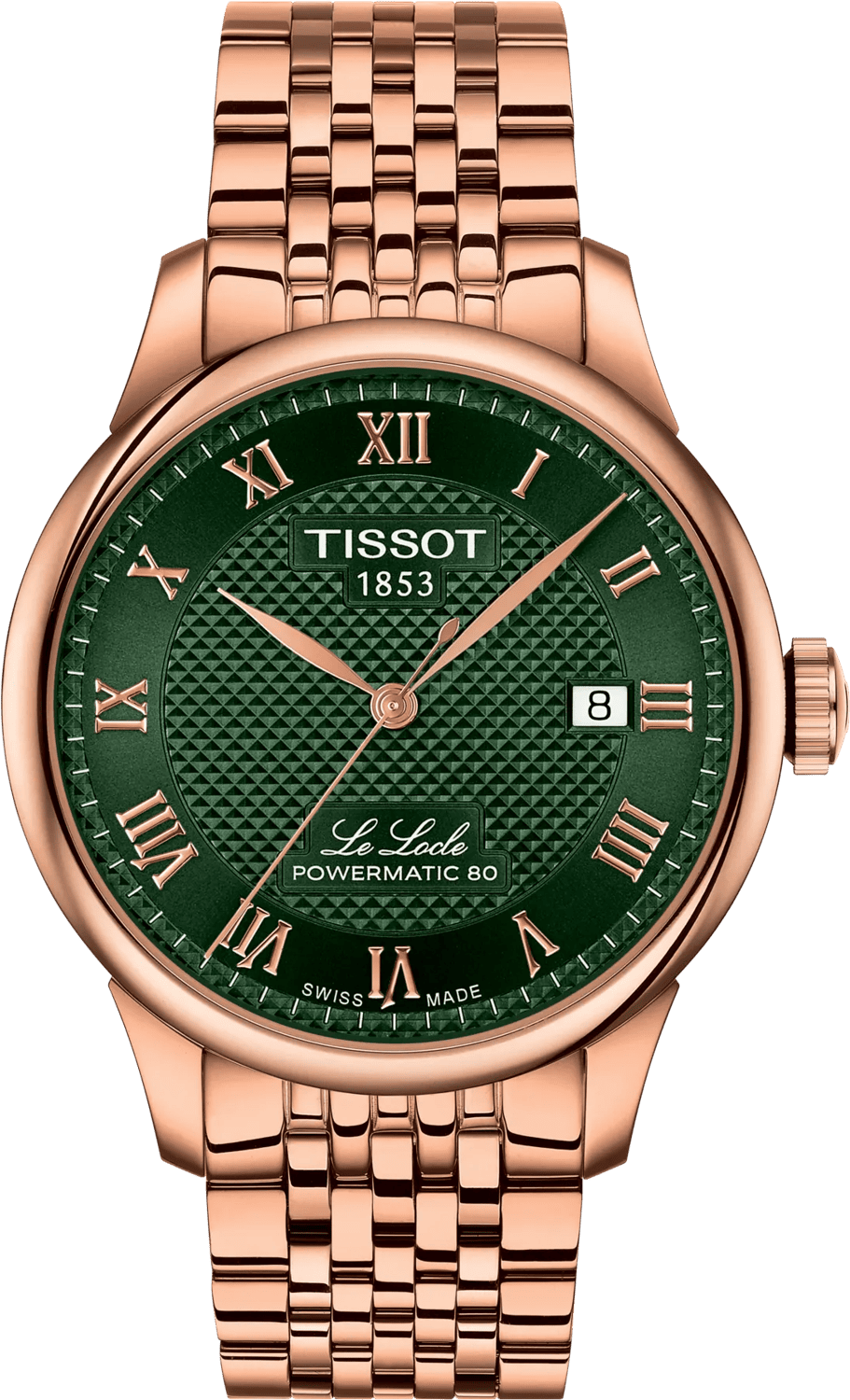 Bộ sưu tập Le Locle được giới thiệu lần đầu vào năm 2003 để kỷ niệm 150 năm thành lập Tissot. Chiếc đồng hồ này là một phần lịch sử, thể hiện tinh thần đổi mới đã định hình thương hiệu của chúng tôi trong hơn một thế kỷ qua. Mẫu đồng hồ này có mặt số màu xanh lá cây và được trang bị dây đeo có thể thay thế nhanh chóng. Tất cả các đồng hồ Le Locle đều có mặt số họa tiết clous de Paris “guilloche” tuyệt đẹp dưới dạng các kim tự tháp nhỏ: một chi tiết thực sự tạo nên sự khác biệt. Sự kết hợp giữa các bề mặt được đánh bóng và chải xước trên các mắt xích tạo nên một nhịp điệu thị giác quyến rũ, bắt sáng với mỗi chuyển động. Chiếc đồng hồ này thể hiện sự quyến rũ của di sản Thụy Sĩ, với tên “Le Locle” được khắc nghiêng trên mặt số, tạo thêm nét tinh tế cho thiết kế. Mẫu đồng hồ này sử dụng công nghệ Nivachron Spring Balance tiên tiến, giúp giảm thiểu đáng kể ảnh hưởng của từ trường đồng thời có khả năng chống sốc, lão hóa và thay đổi nhiệt độ. Bộ sưu tập: Classic Traditional. Trọng lượng: 122 g. Quốc gia sản xuất: Thụy Sĩ. Chiều dài: 39,30 mm. Chiều rộng: 39,30 mm. Độ dày: 9,75 mm. Khoảng cách càng: 19 mm. Khả năng chống nước: Chống nước ở áp suất lên đến 3 bar (30 m / 100 ft). Hình dáng vỏ: Tròn. Chất liệu vỏ: Thép không gỉ 316L phủ PVD vàng hồng. Tùy chọn vỏ: Mặt lưng trong suốt. Mặt kính: Sapphire chống trầy xước. Năng lượng: Tự động. Bộ máy: Automatic Thụy Sĩ. Thời gian trữ cót: Lên đến 80 giờ. Chức năng: Lò xo cân bằng Nivachron được cấp bằng sáng chế. Hiển thị: Giờ, phút, giây, ngày (HMSD). Caliber: 11 1/2'''. Đường kính máy: 25,6 mm. Màu mặt số: Xanh lá. Cọc số: Số La Mã. Mã dây/vòng: T605051523. Lớp phủ dây: PVD. Màu dây: Vàng hồng 5N. Khóa: Khóa bướm có nút bấm, dây tháo lắp nhanh. Tùy chọn khóa: Dây tháo lắp nhanh. Mã mắt dây: T613051524.