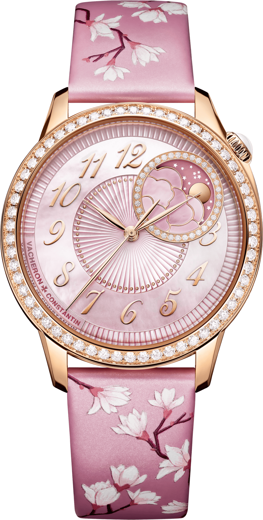Vacheron Constantin giới thiệu chiếc đồng hồ này bằng vàng hồng 18K 5N. Phiên bản giới hạn 100 chiếc này có mặt số khảm xà cừ màu hồng với họa tiết xếp nếp, tương tự như chất liệu vải Haute Couture. Đồng hồ được trang bị dây đeo bằng da bê vẽ tay với họa tiết hoa, làm cho mỗi phiên bản trở nên độc đáo. Xung quanh những đám mây xà cừ, không dưới 36 viên kim cương cắt brilliant bao quanh Mặt Trăng và bầu trời đầy sao. Vòng bezel của chiếc đồng hồ này được chiếu sáng bởi 58 viên kim cương cắt brilliant, trong khi núm vặn được đính đá mặt trăng. Để người dùng có thể trải nghiệm nhiều kiểu đeo khác nhau, đồng hồ đi kèm với ba dây đeo dễ dàng thay đổi: da cá sấu, vải dệt "gros grain" và da bê được trang trí thủ công. Đường kính 37 mm. Độ dày 10,23 mm. Khả năng chống nước 3 bar (30 m). Mặt sau bằng kính sapphire trong suốt. Mô tả mặt số: Mặt số khảm xà cừ màu hồng nhạt với họa tiết xếp nếp. Nhẫn vàng 18K đính 36 viên kim cương tròn cắt giác (~0,1cts), bao quanh mặt trăng lệch tâm. Đĩa mặt trăng bằng vàng 18K và những đám mây xà cừ màu tím nhạt. Vạch chia phút hình tròn bằng ngọc trai. Kim giờ/phút hình lá bằng vàng 18K. Các vạch chỉ giờ bằng chữ số Ả Rập bằng vàng 18K. Chất liệu dây đeo: Da bê (Hồng). Hệ thống khóa: Khóa Ardillon (vàng hồng 18K). Phụ kiện bổ sung: Da cá sấu (Hồng), Vải (Hồng). Xuất xứ đồng hồ: Thụy Sĩ. Bộ máy: Tự động lên dây. Chức năng: Giờ, Giây trung tâm, Chu kỳ mặt trăng, Phút, Dừng cân bằng. Đường kính: 30 mm. Độ dày: 5,03 mm. Số bộ phận: 164. Số chân kính: 24. Dự trữ năng lượng: 40 giờ. Tần số: 28800 V.P.H. (4 Hz)