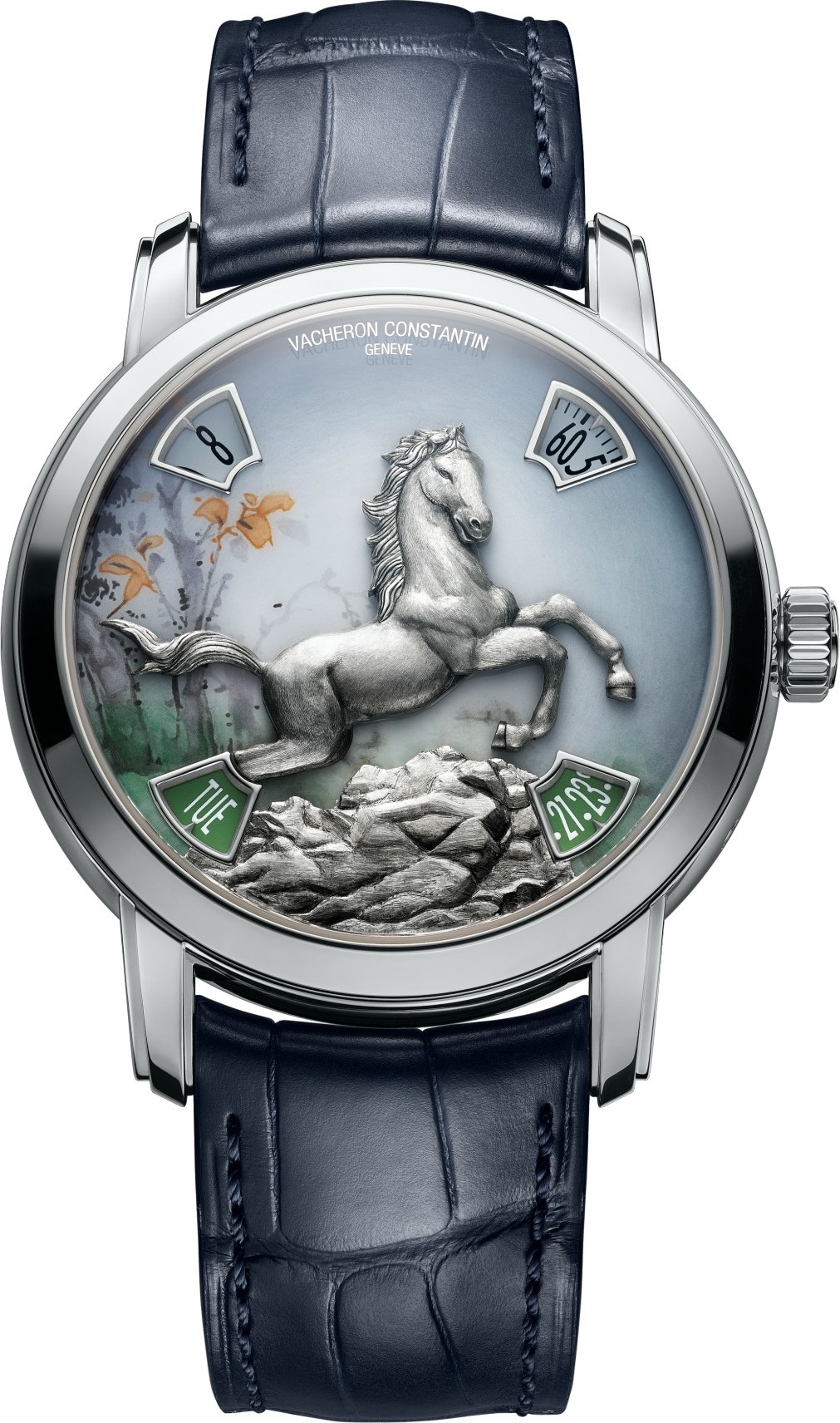 Được tạo nên bằng kỹ thuật khắc thủ công tinh xảo, hình ảnh con ngựa được tôn kính trong văn hóa Trung Quốc như một món quà may mắn, tràn đầy sức sống và tự do. Vẻ đẹp của loài vật này được tôn lên bởi nền họa tiết động vật được thể hiện bằng men mờ thu nhỏ. Chiếc đồng hồ phiên bản giới hạn bằng bạch kim 950 này tái hiện lại kỹ thuật chế tác thủ công nhờ vào chuyên môn của các nghệ nhân khắc và tráng men bậc thầy. Bộ máy tự động của đồng hồ được đóng dấu chứng nhận Geneva, một sự đảm bảo về chất lượng và độ tin cậy. Đường kính 40 mm. Độ dày 12,72 mm. Khả năng chống nước 3 bar (30 m). Mặt sau bằng kính sapphire trong suốt. Chất liệu dây đeo bằng da cá sấu (màu xanh đậm). Loại khóa gập ba. Chất liệu khóa bạch kim 950. Xuất xứ đồng hồ: Thụy Sĩ. Chứng nhận: Chứng nhận Geneva. Mã hiệu: 2460 G4/3. Năng lượng: Tự động lên dây. Chức năng: Giờ hiển thị qua ô cửa sổ, Thứ hiển thị qua ô cửa sổ, Thứ trong tuần hiển thị qua ô cửa sổ, Dừng cân bằng, Phút hiển thị qua ô cửa sổ. Đường kính 31 mm. Độ dày 6,05 mm. Số bộ phận: 237. Số chân kính: 27. Dự trữ năng lượng: 40 giờ. Tần số: 28800 V.P.H. (4 Hz)