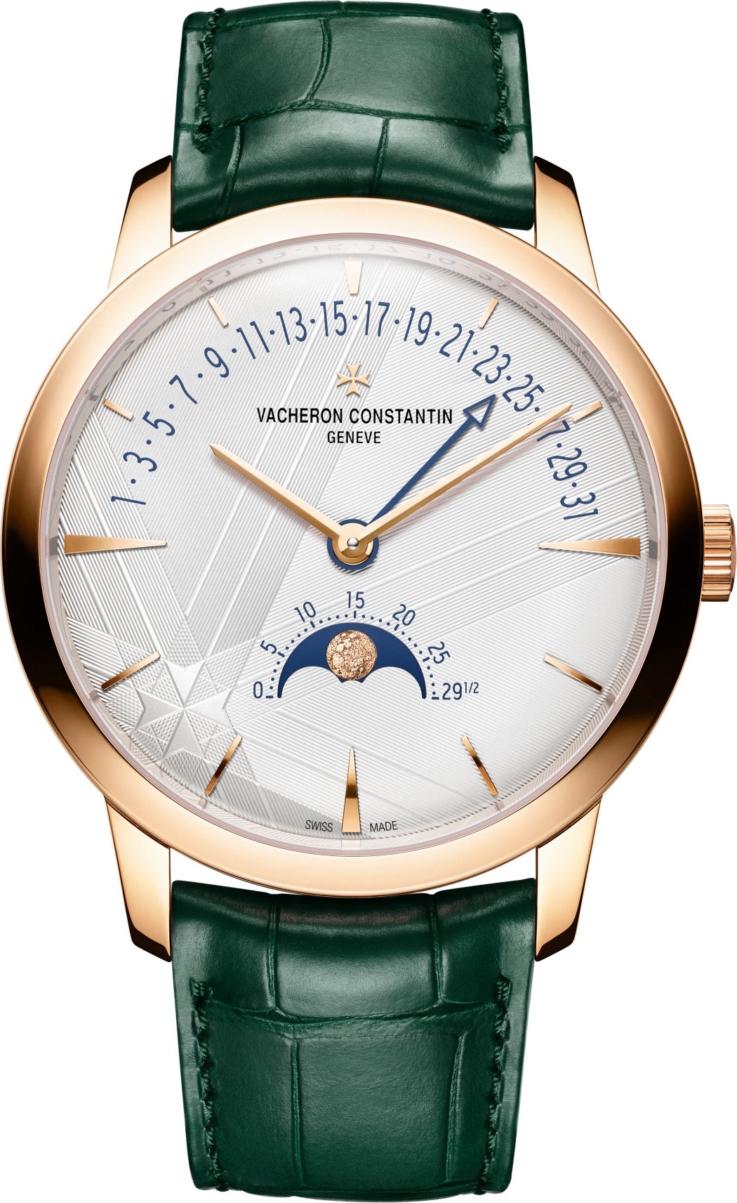Để kỷ niệm 270 năm cống hiến cho lịch sử và chuyên môn, Maison hân hạnh giới thiệu phiên bản giới hạn 270 chiếc bằng vàng hồng 18K 5N. Thanh lịch và mang tính biểu tượng, mặt số được trang trí bằng họa tiết độc đáo lấy cảm hứng từ chữ thập Malta, tạo ra hiệu ứng ánh sáng mê hoặc. Các vạch chỉ giờ uốn lượn nhẹ nhàng theo đường cong của mặt số. Lớp hoàn thiện "côte unique" và chữ ký kỷ niệm tinh tế tô điểm cho bộ máy tự động. Chức năng hiển thị ngày kiểu retrograde và chu kỳ mặt trăng chính xác, chỉ cần điều chỉnh một lần mỗi 122 năm, tạo thêm nét thơ mộng đồng thời tăng khả năng dễ đọc. Đường kính 42,5 mm. Độ dày 9,7 mm. Khả năng chống nước 3 bar (30 m). Mặt sau bằng kính sapphire trong suốt. Mô tả mặt số: Mặt số màu bạc được trang trí bằng họa tiết kỷ niệm 270 năm lấy cảm hứng từ chữ thập Malta. Vùng ngoài lồi. Mặt trăng bằng vàng 18K. Ngày kiểu retrograde bằng kim. Kim giờ/phút kiểu baton hai mặt bằng vàng 18K. Kim ngày màu xanh lam bằng vàng 18K. Các vạch chỉ giờ bằng vàng 18K. Chất liệu dây đeo: Da cá sấu (Xanh lá cây). Loại khóa: Khóa Ardillon. Chất liệu khóa: Vàng hồng 18K. Xuất xứ đồng hồ: Thụy Sĩ. Chứng nhận: Dấu hiệu Geneva. Mã hiệu: 2460 R31L/270. Năng lượng: Tự động lên dây. Chức năng: Ngày kiểu kim chỉ ngược, Chu kỳ mặt trăng chính xác, Dừng cân bằng, Phút, Giờ. Đường kính: 27,2 mm. Độ dày: 5,4 mm. Số bộ phận: 275. Số chân kính: 27. Thời gian dự trữ năng lượng: 40 giờ. Tần số: 28800 V.P.H. (4 Hz)