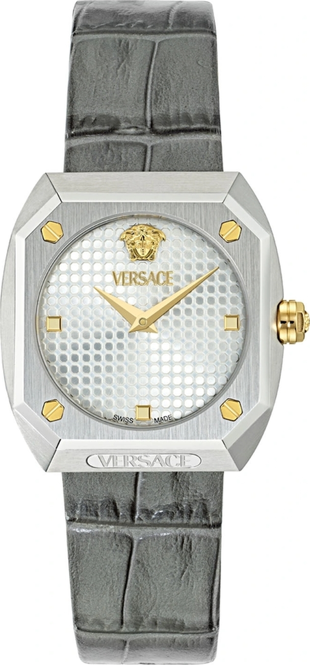 Chiếc đồng hồ Versace này có vỏ làm bằng thép không gỉ với đường kính 41 mm và được trang bị dây đeo da. Bên trong vỏ là một bộ chuyển động Ronda và đồng hồ có tinh thể Sapphire.