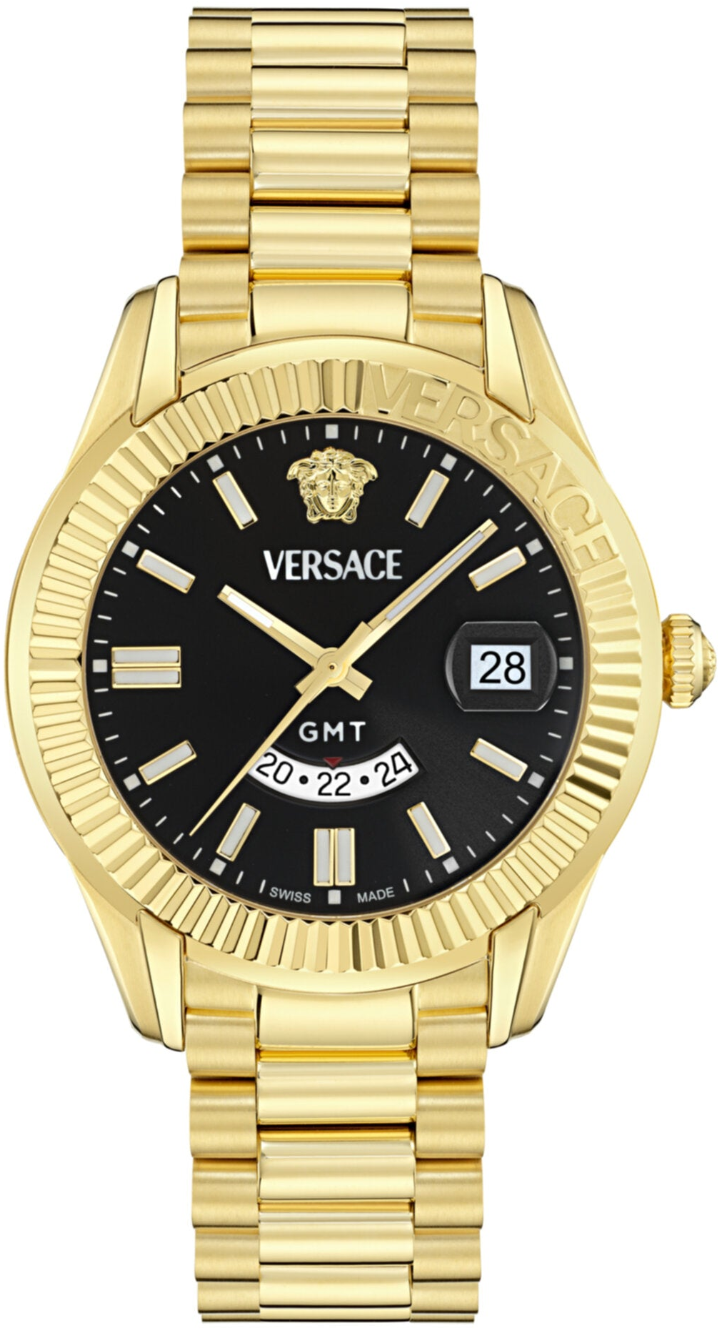 Bộ sưu tập này nổi bật với mặt số thanh mảnh được trang trí bằng họa tiết tia nắng và biểu tượng Medusa 3D ở vị trí 12 giờ. Vỏ đồng hồ được trang bị cửa sổ GMT ở vị trí 6 giờ và cửa sổ ngày bằng kính cường lực tuyệt đẹp ở vị trí 3 giờ, 41mm. Vỏ vàng IP. Dây đeo vàng IP. Mặt số đen tia nắng. 5 ATM. Khóa Deployant.